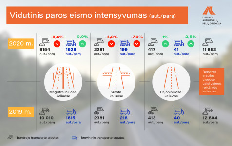 Compared to 2019, general traffic flows decreased by 8.6 per cent on the state significance main roads in 2020. However, traffic volumes of road trains, i. e. towing vehicles coupled with trailers or semi-trailers (loading >12 t), (later – towing vehicles), increased by 2.6 per cent and heavy goods vehicles by 0.9 per cent.
