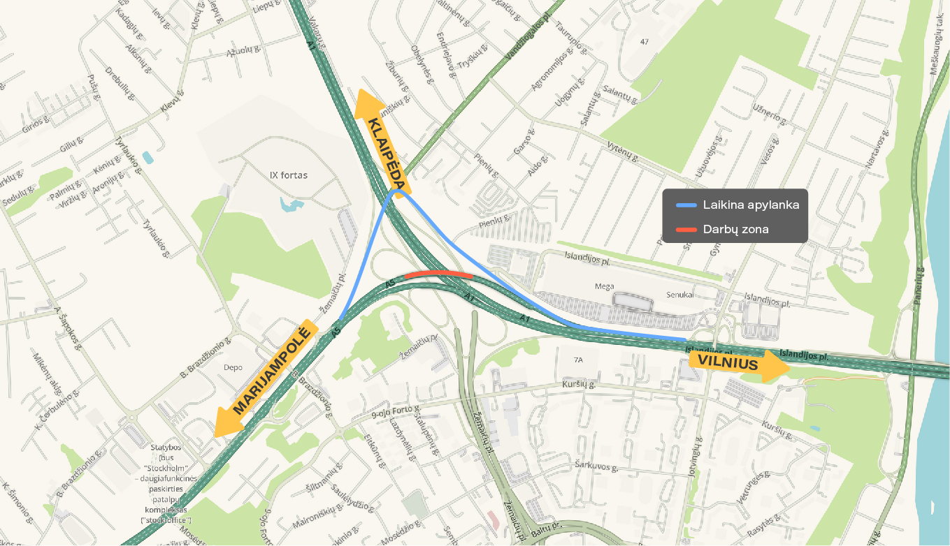 Lietuvos automobilių kelių direkcija informuoja, jog birželio 5 d., nuo 20 val. iki birželio 6 d. 4 val. ryto, laikinai uždaroma valstybinės reikšmės magistralinio kelio A5 Kaunas–Marijampolė–Suvalkai 0,00 km estakada. Eismas bus leidžiamas pagal schemą šalia esančia apylanka (pav.). Vairuotojų prašome būti atidžiais, sekti informacinius kelio ženklus.