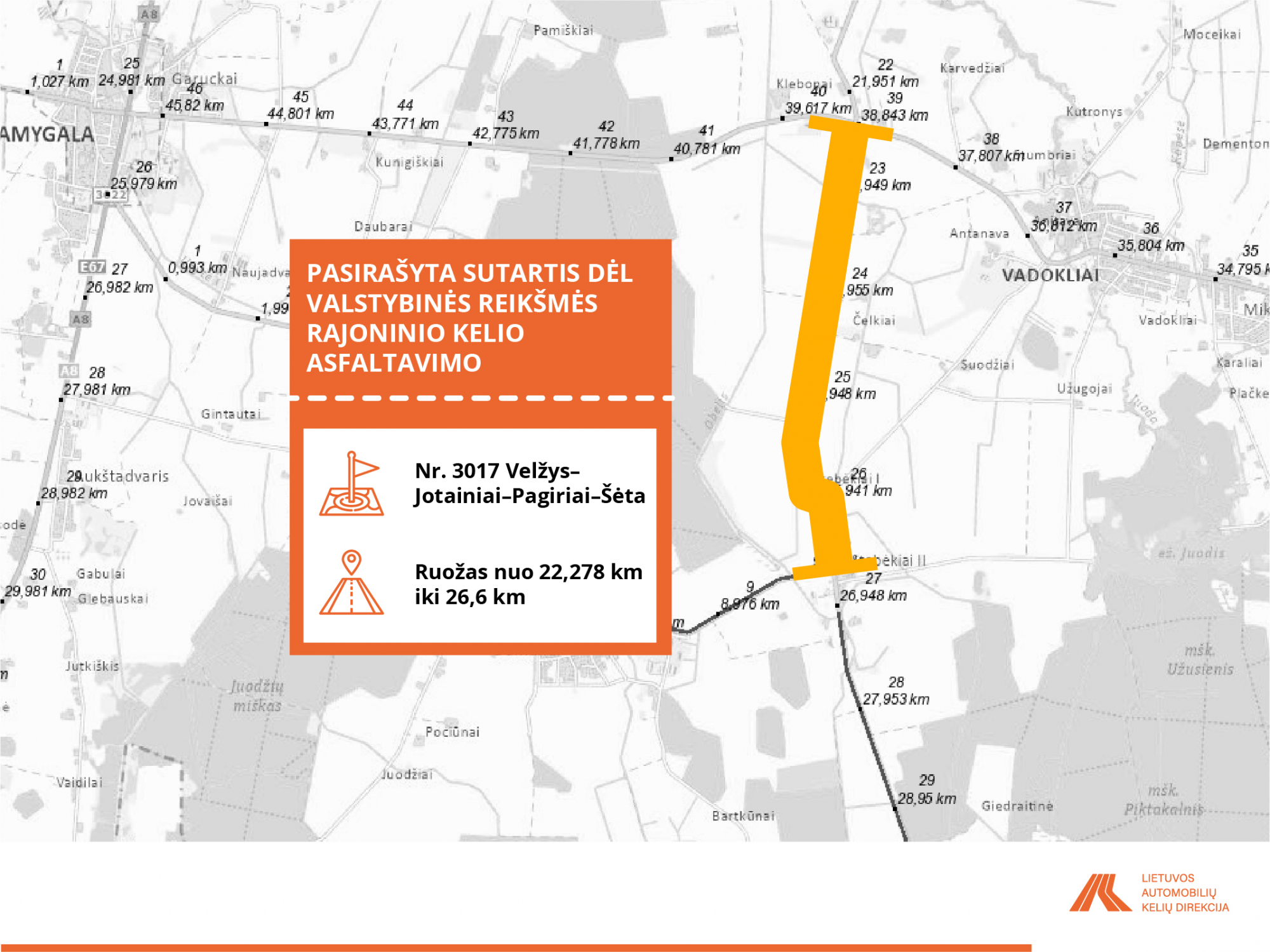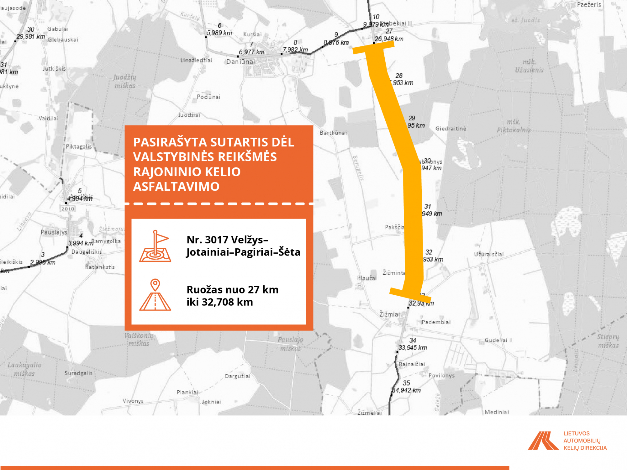 - Kelio Nr. 3017 Velžys–Jotainiai–Šėta ruožas nuo 22,278 iki 26,60 ir nuo 27,00 iki 32,708 km;