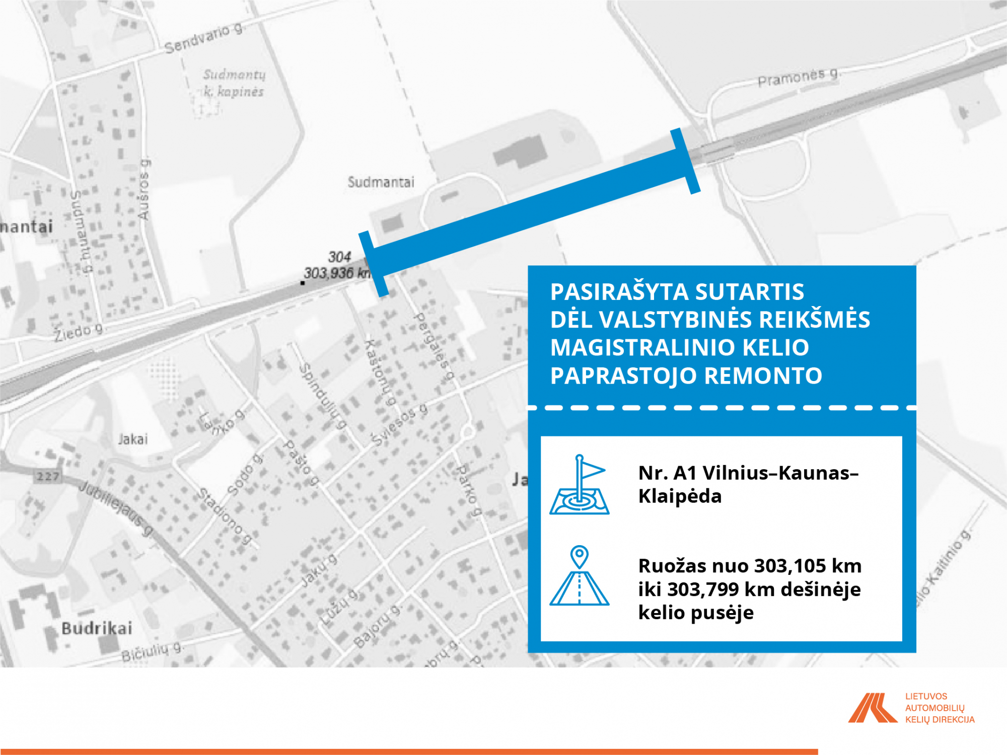 • Nr. A1 Vilnius–Kaunas–Klaipėda, ruožas nuo 303,105 iki 303,799 km, dešinė kelio pusė.