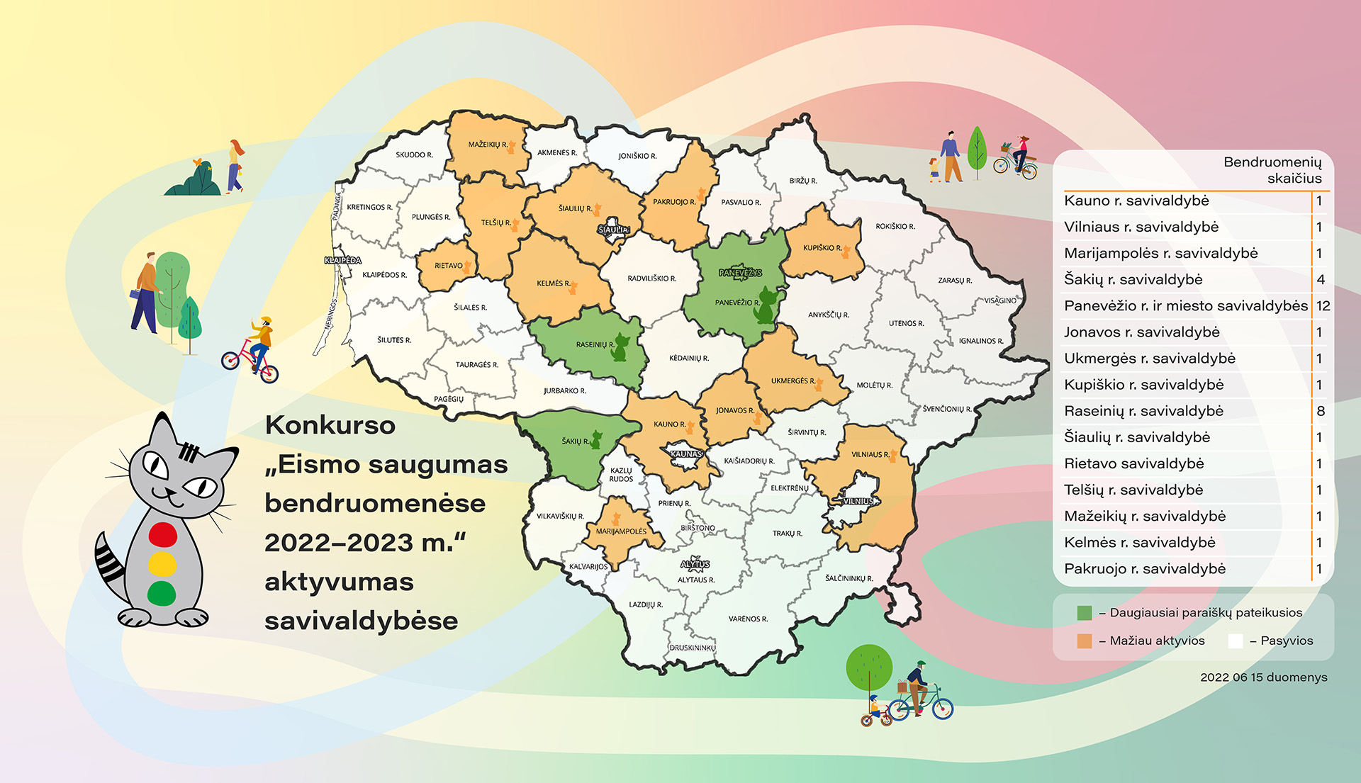 Valstybės įmonė Lietuvos automobilių kelių direkcija (toliau – Kelių direkcija) primena, kad tęsiasi paraiškų dalyvauti saugaus eismo konkurse „Eismo saugumas bendruomenėse 2022–2023 m.“ pateikimas ir kviečia Lietuvos kaimų ir miestelių bendruomenes aktyviau registruotis, organizuoti saugaus eismo renginius. Bendruomenės, norinčios dalyvauti Konkurse, paraiškas gali teikti nuo 2022 m. gegužės mėn. iki birželio 30 d.