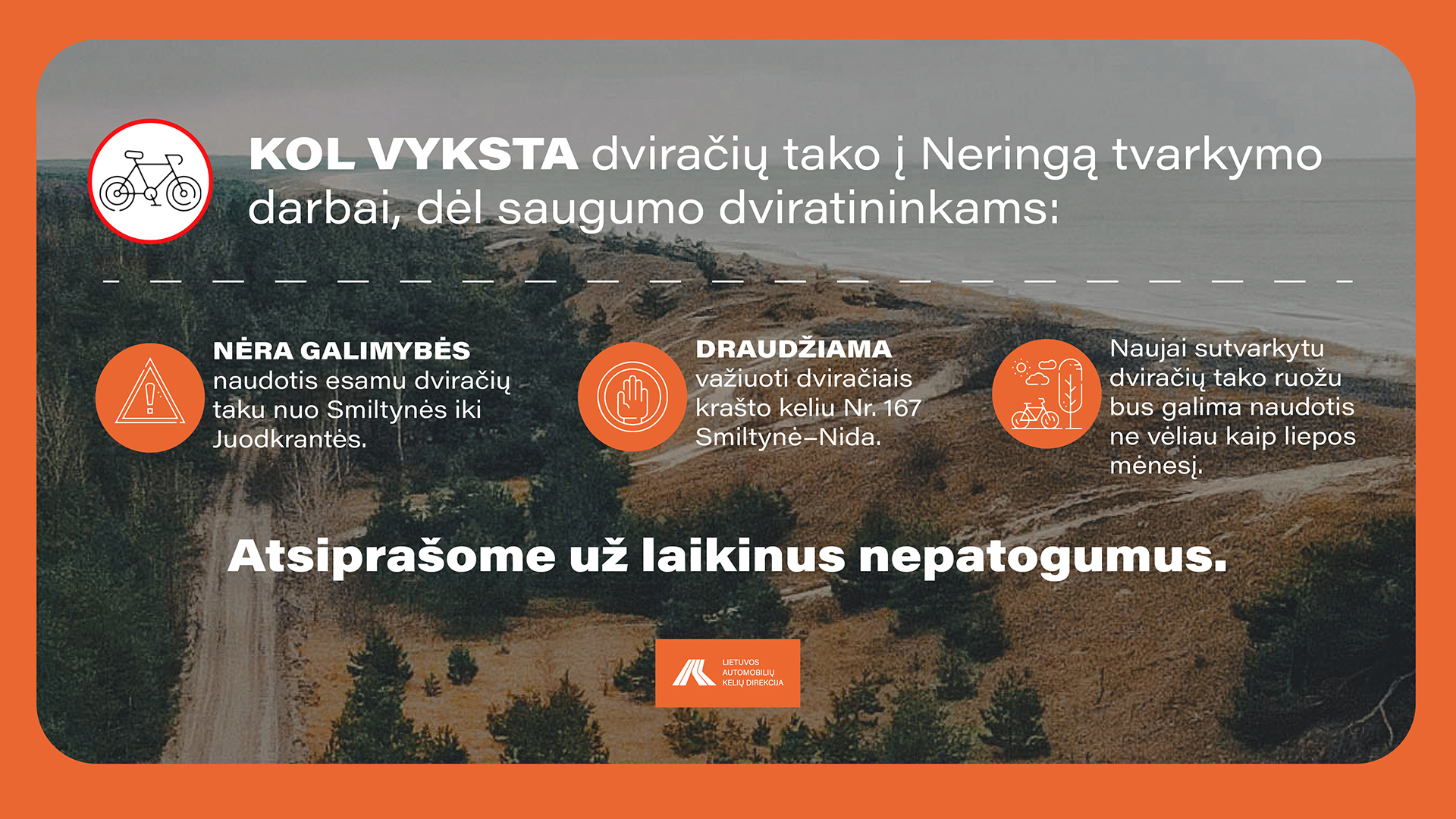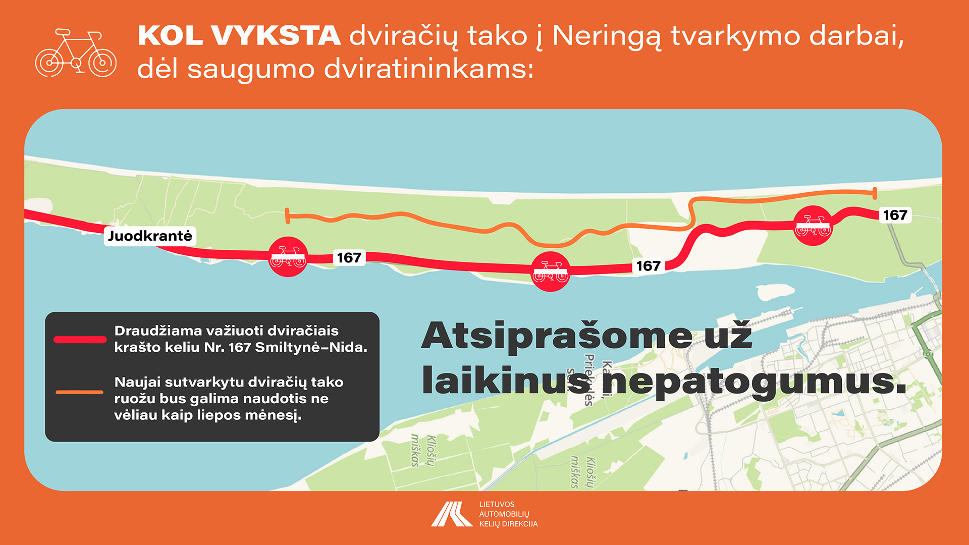 Siekiant išvengti galimų nelaimingų atsitikimų ar net žūčių, eismo dalyvių saugumui laikinai draudžiamas dviratininkų eismas ne tik rekonstruojamu dviračių taku nuo Smiltynės iki Juodkrantės, bet ir valstybinės reikšmės krašto keliu Nr. 167 Smiltynė–Nida.