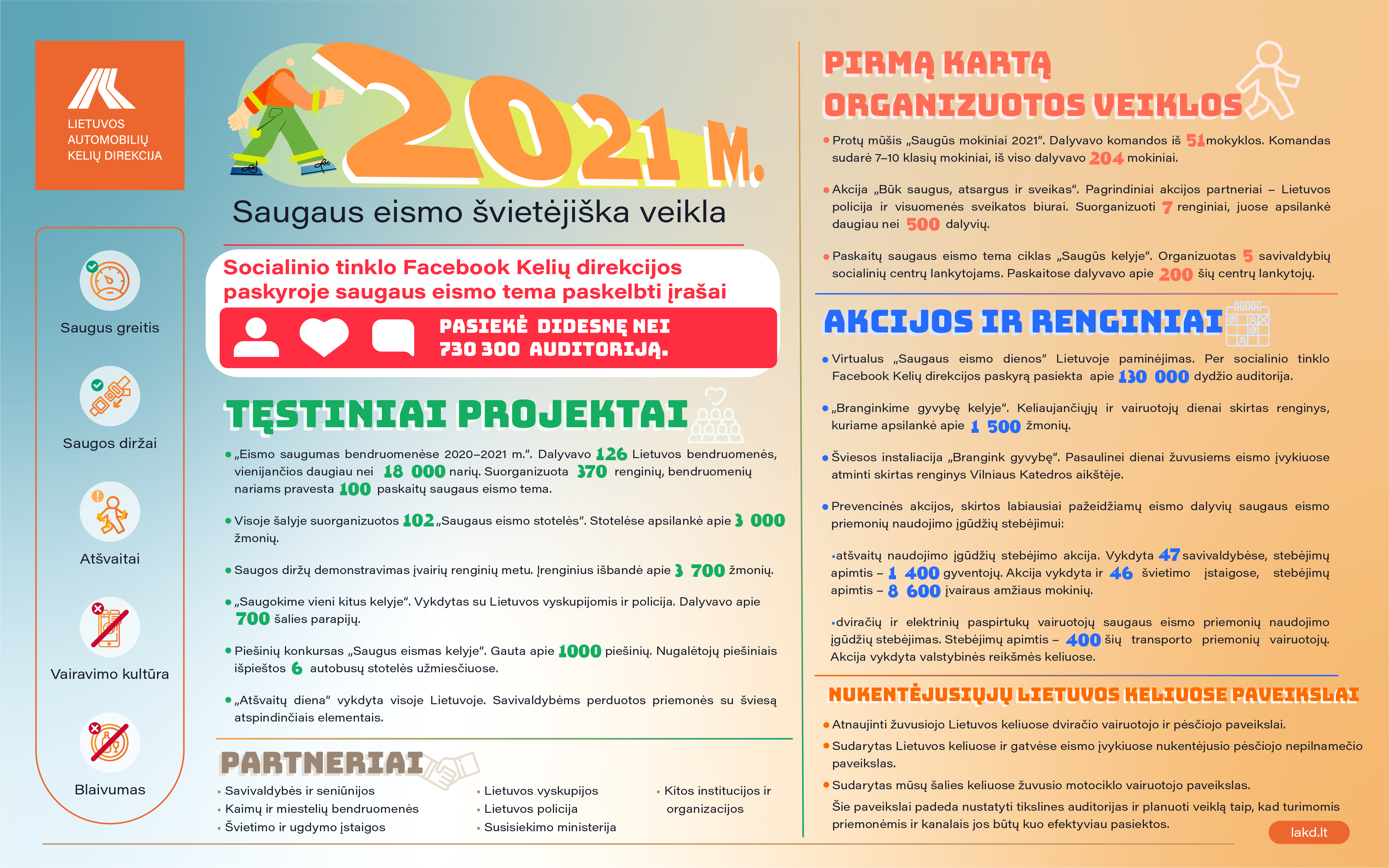 Valstybės įmonė Lietuvos automobilių kelių direkcija (toliau – Kelių direkcija), vykdydama saugaus eismo švietėjišką veiklą, 2021 m. per tiesioginės komunikacijos projektus pasiekė didesnę nei 72 tūkst. auditoriją.