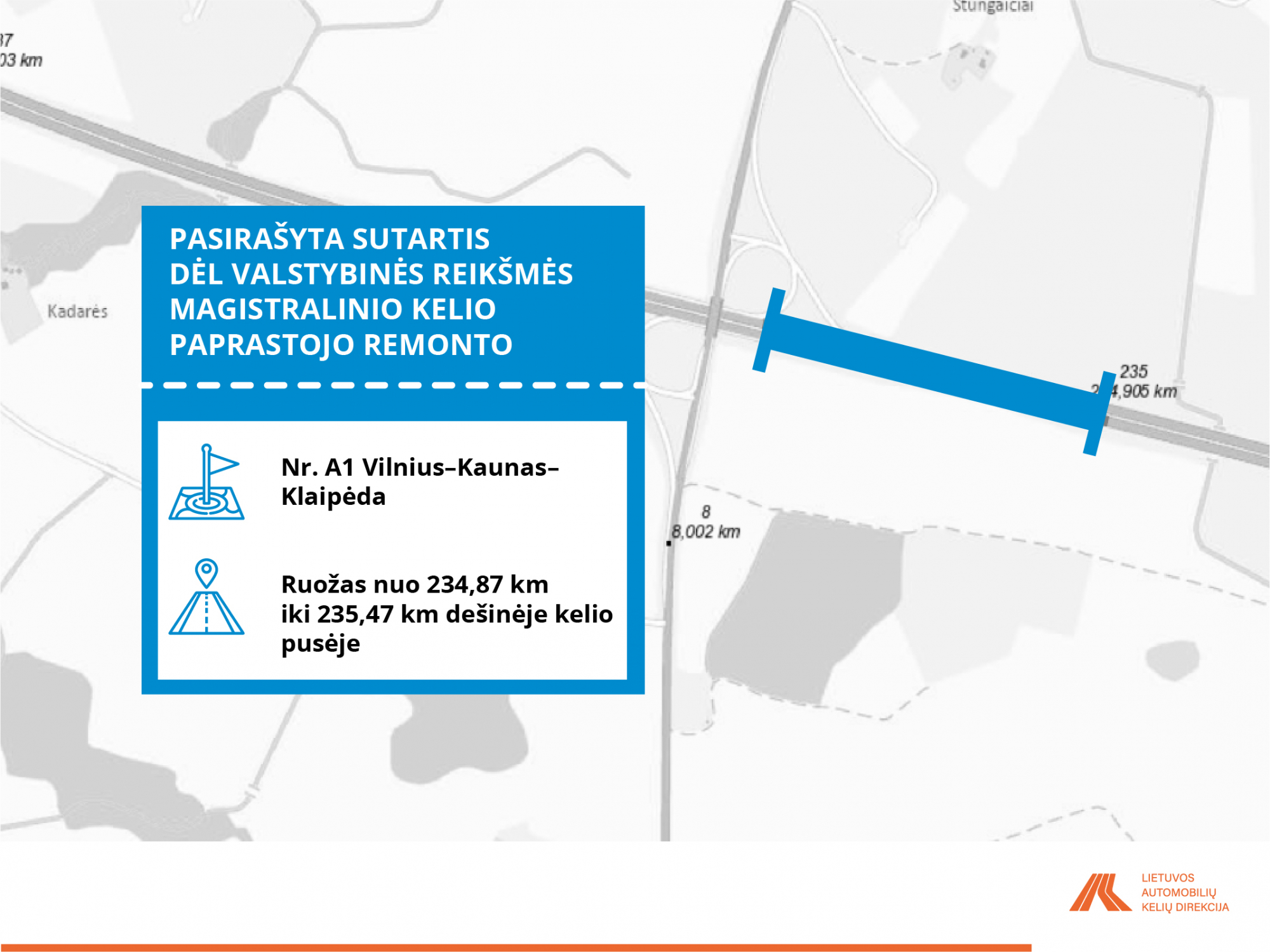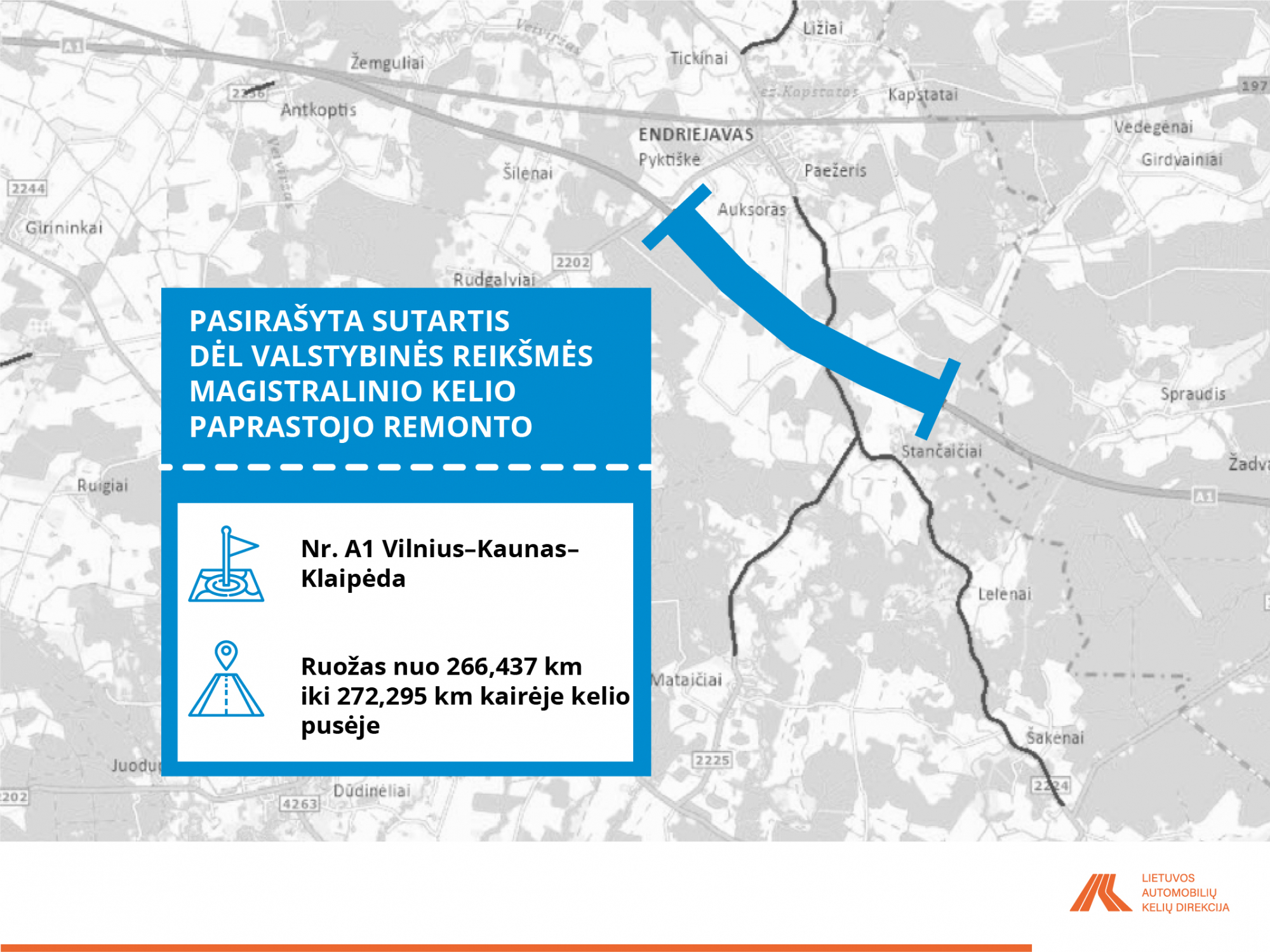 Lietuvos automobilių kelių direkcija su rangovais pasirašė 7 magistralinio kelio A1 Vilnius–Kaunas–Klaipėda paprastojo remonto ir 5 žvyrkelių asfaltavimo sutartis.