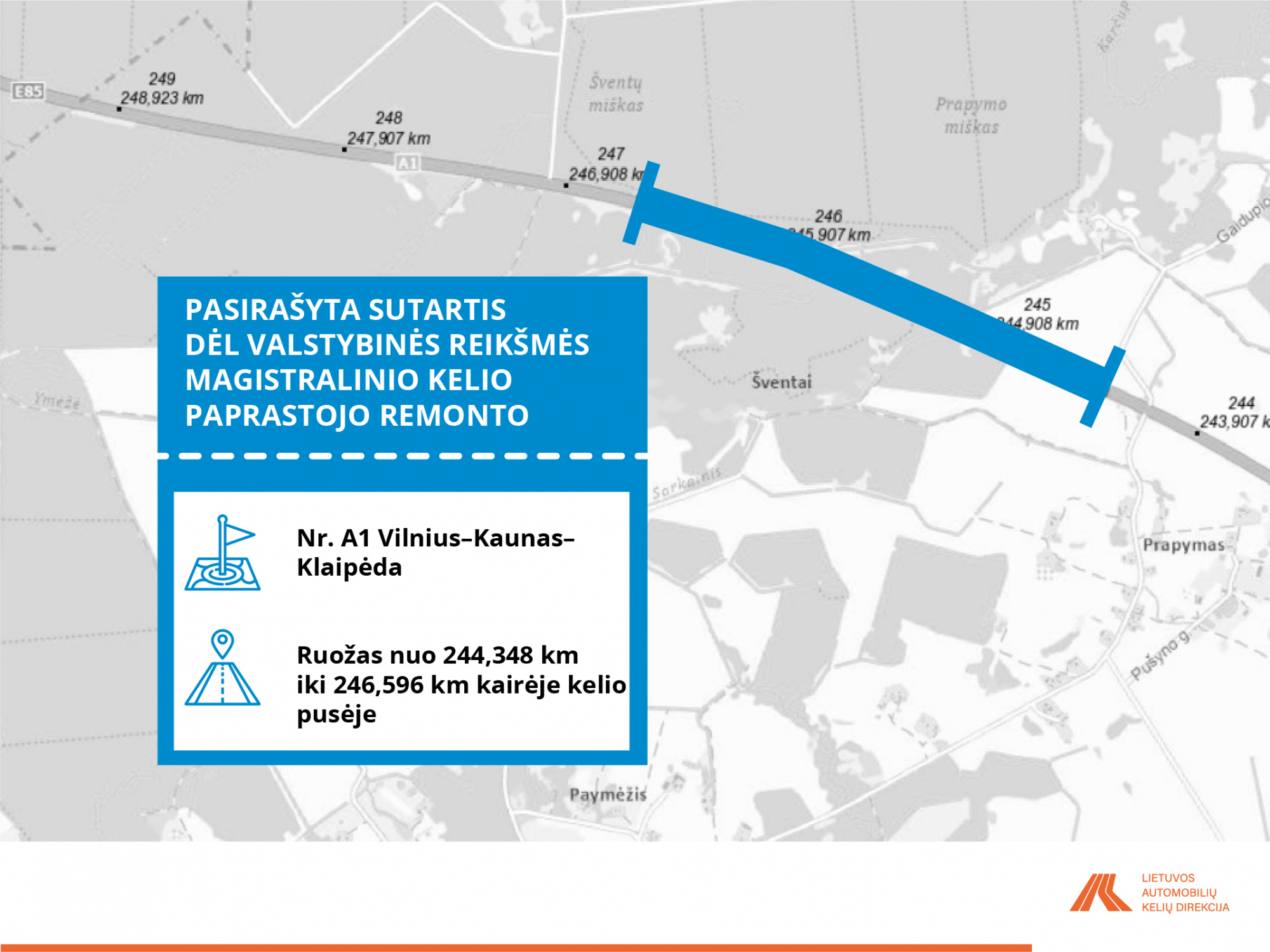 Paprastojo remonto darbai magistralinio kelio A1 Vilnius–Kaunas–Klaipėda bus vykdomi šiuose ruožuose: