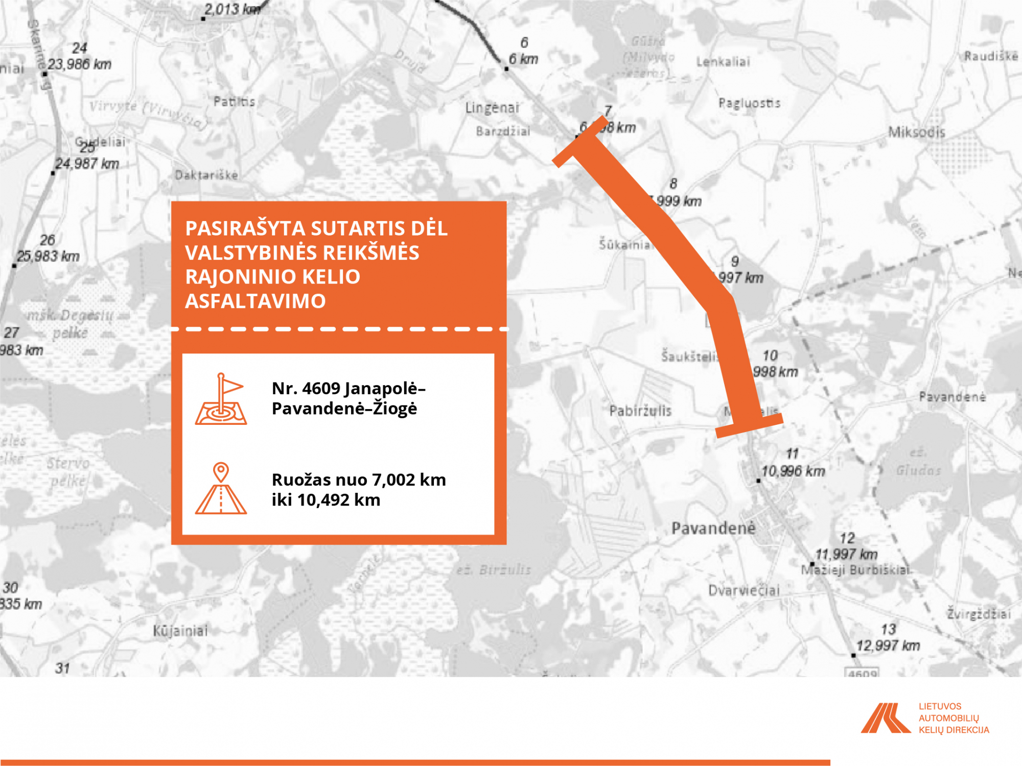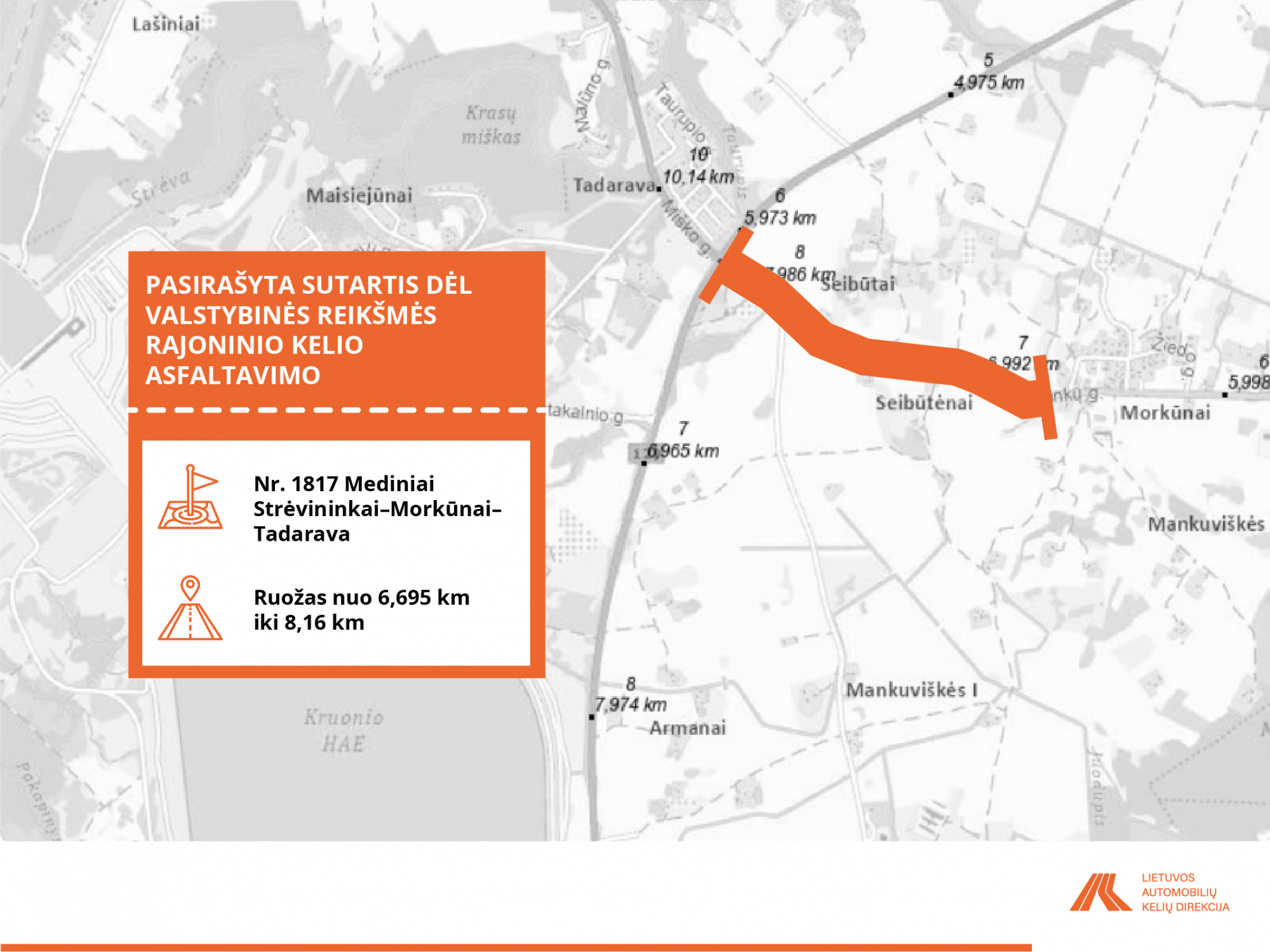 Žvyrkelių asfaltavimo darbus planuojama atlikti Mažeikių, Telšių, Kaišiadorių rajonų bei Marijampolės ir Pagėgių savivaldybių valstybinės reikšmės rajoninių kelių ruožuose: