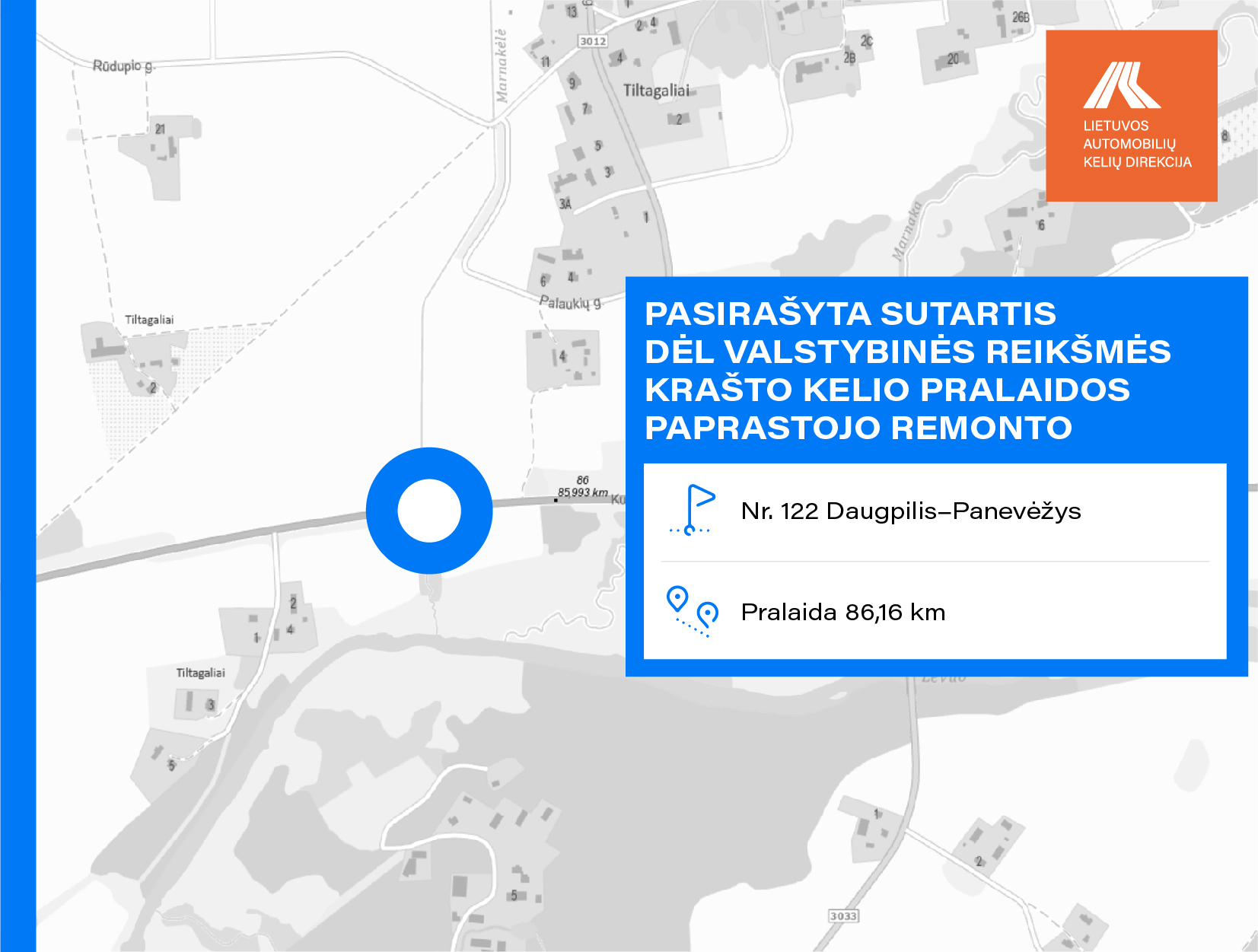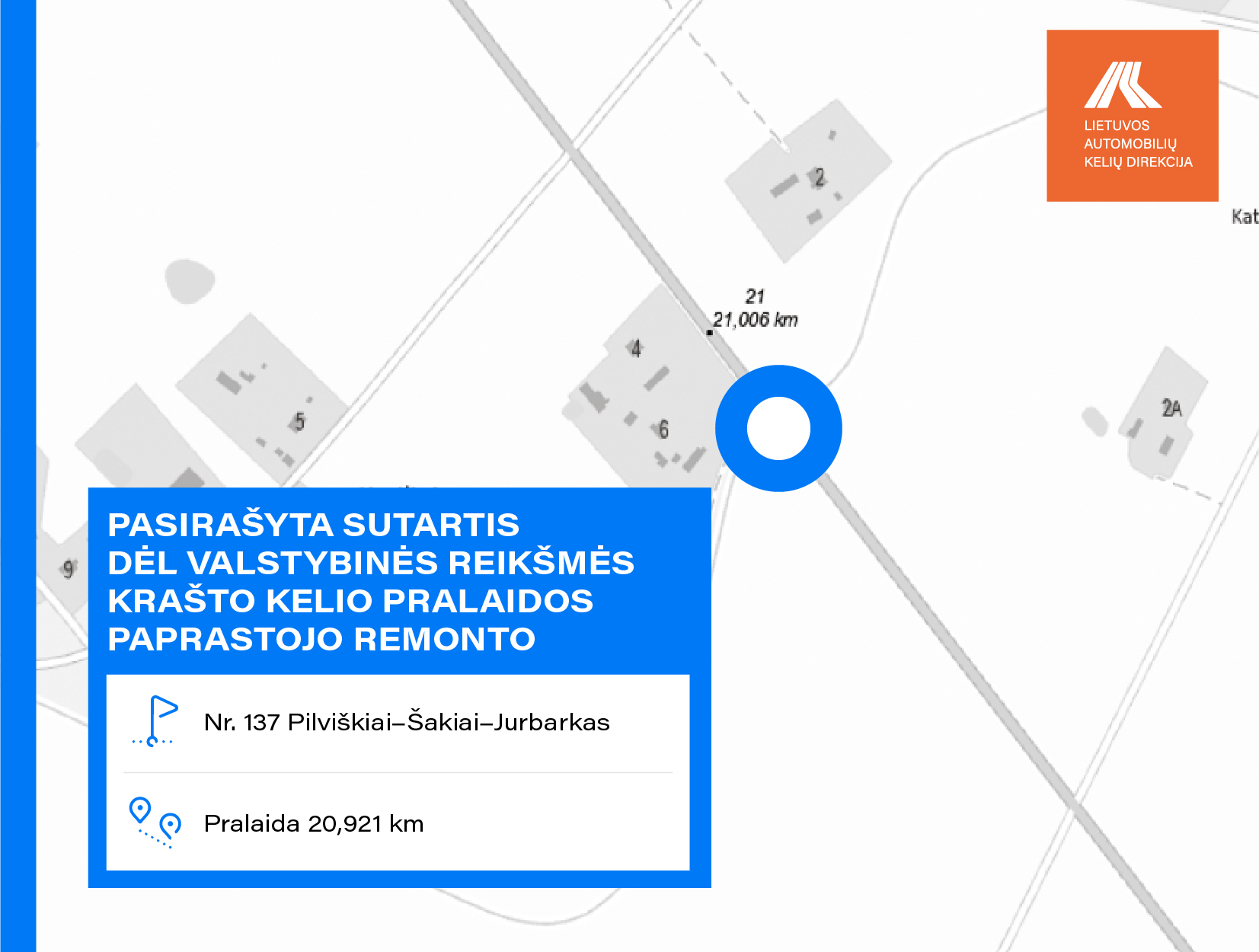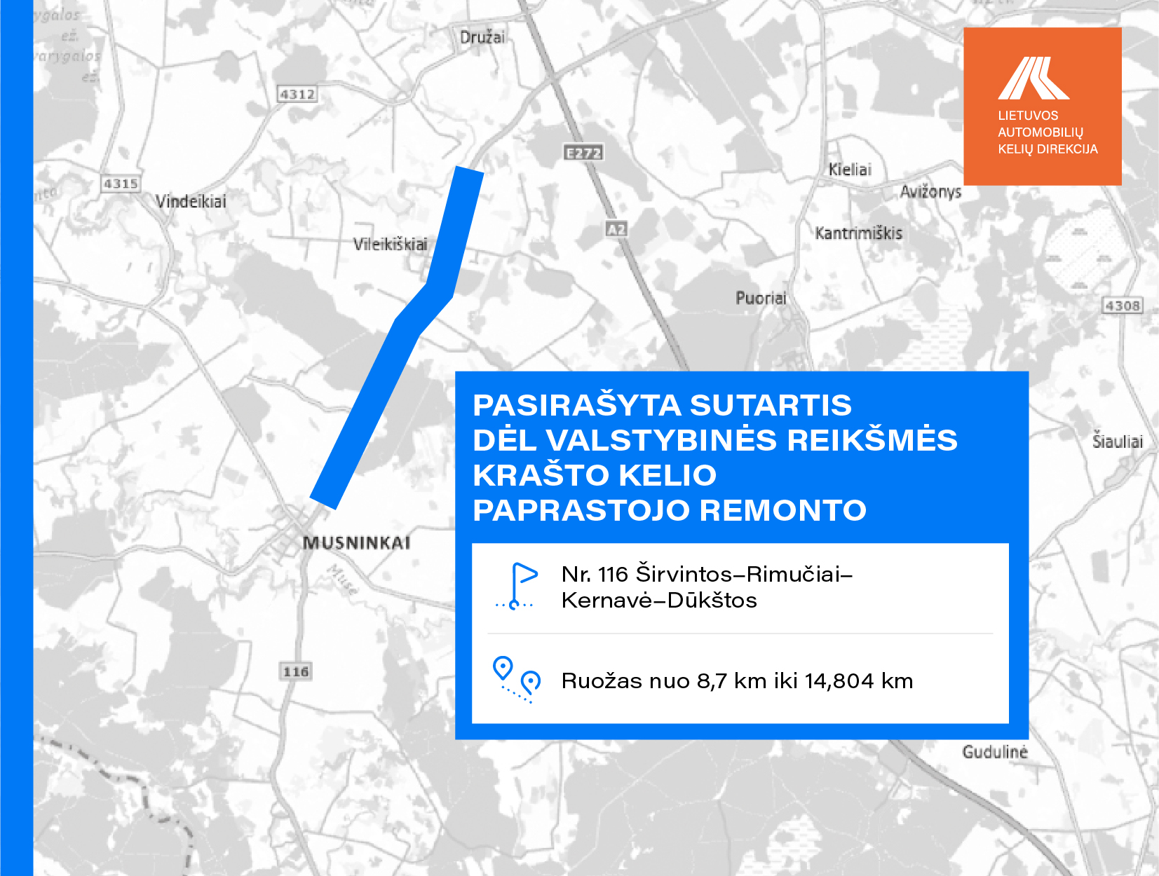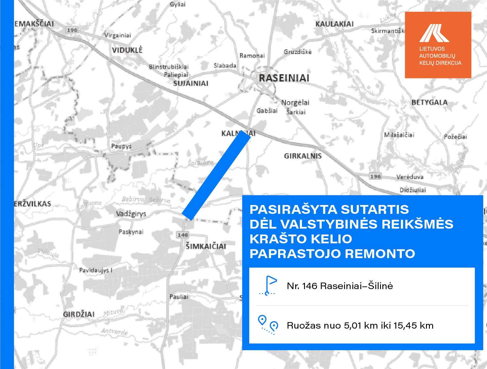 VĮ Lietuvos automobilių kelių direkcija su rangovais sudarė 18 rangos darbų sutarčių. Įgyvendinant sutartis Marijampolės, Kaišiadorių, Kelmės, Vilkaviškio, Prienų, Biržų, Pagėgių, Širvintų, Šilutės, Raseinių, Šakių, Rokiškio, Zarasų, Šiaulių, Plungės, Jurbarko rajonuose, bus vykdomi valstybinės reikšmės krašto ir rajoninių kelių paprastojo ir kapitalinio remonto darbai. Taip pat numatytas tilto per Kamoną krašto kelyje Nr. 141 Kaunas–Jurbarkas–Šilutė–Klaipėda rekonstravimas.