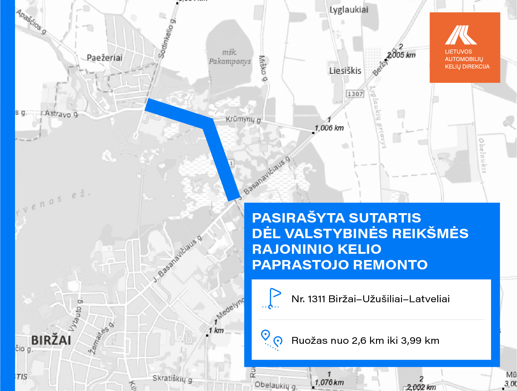 • Nr. 1311 Biržai–Užušiliai–Latveliai ruože nuo 2,600 iki 3,990 km;