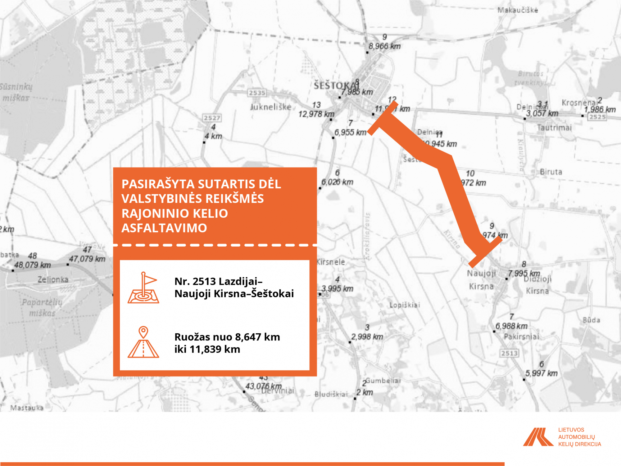 • Nr. 2513 Lazdijai–Naujoji Kirsna–Šeštokai ruožo nuo 8,647 iki 11,839 km;