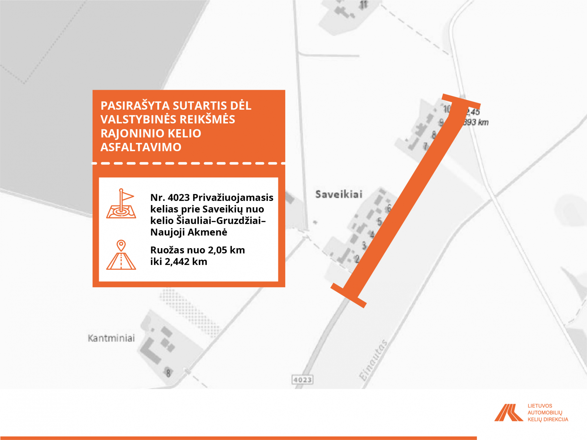 • Nr. 4023 Privažiuojamasis kelias prie Saveikių nuo kelio Šiauliai–Gruzdžiai–Naujoji Akmenė ruožas nuo 2,050 iki 2,442 km.