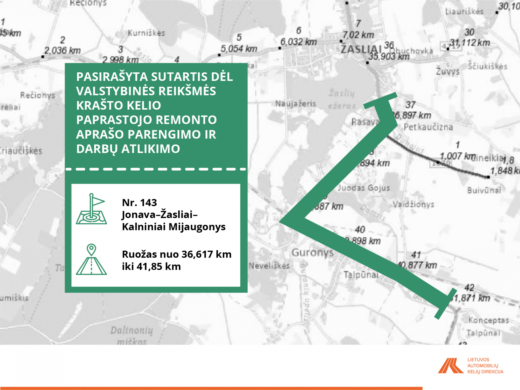 • Krašto kelio Nr. 143 Jonava–Žasliai–Kalniniai Mijaugonys ruožo nuo 36,617 iki 41,850 km;