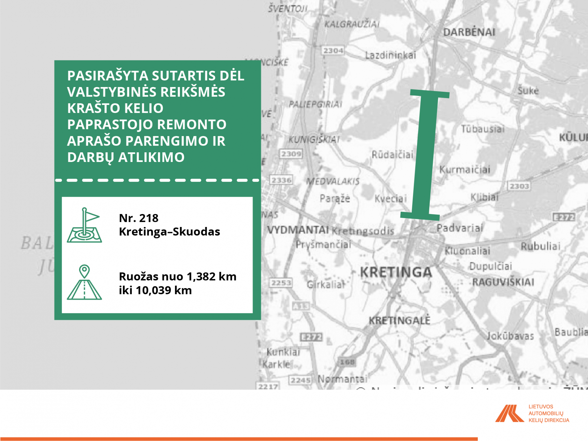 • Krašto kelio Nr. 218 Kretinga–Skuodas ruožas nuo 1,382 iki 10,039 km;