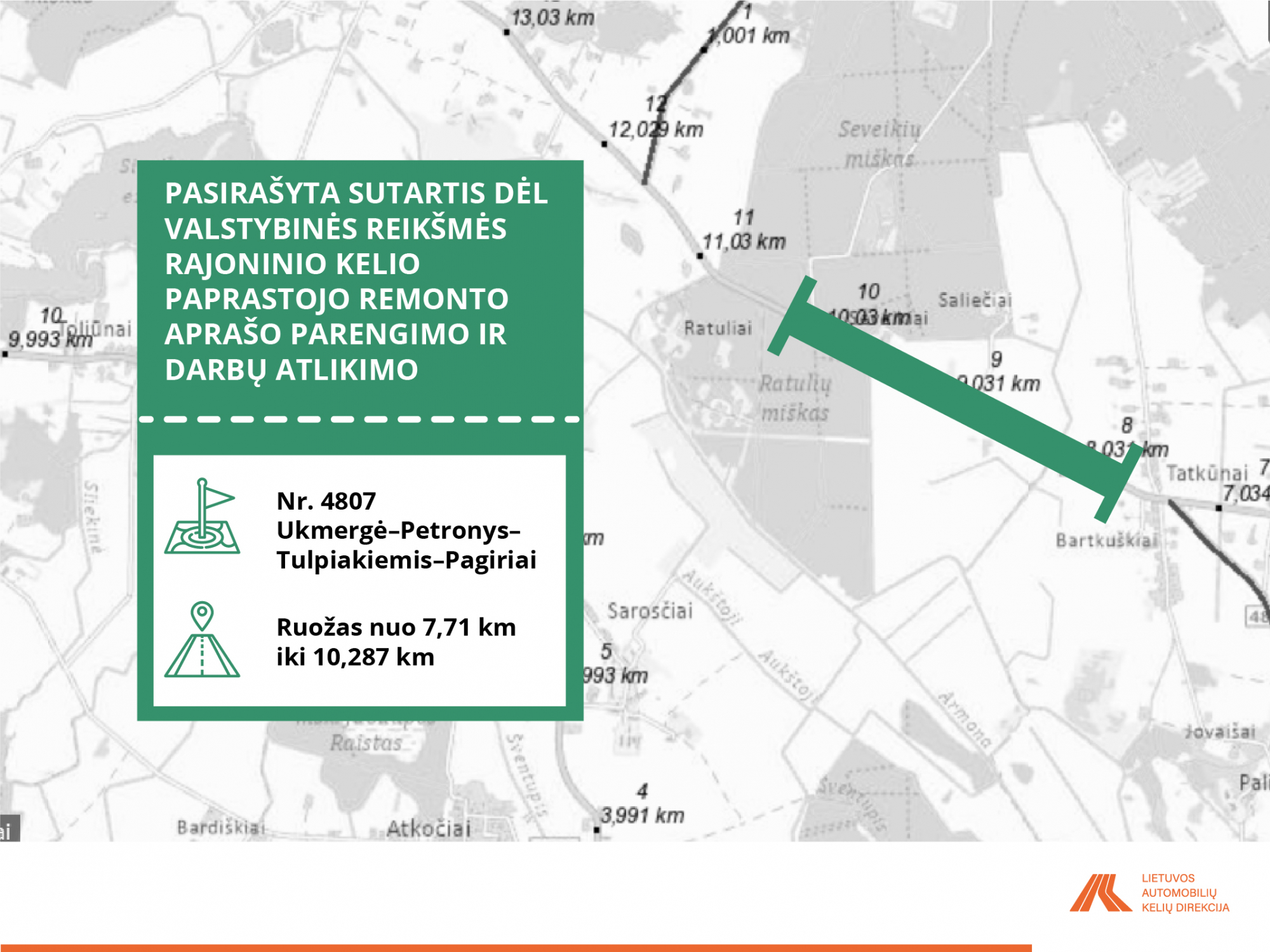 • Rajoninio kelio Nr.4807 Ukmergė–Petronys–Tulpiakiemis–Pagiriai ruožas nuo 7,71 iki 10,287 km;