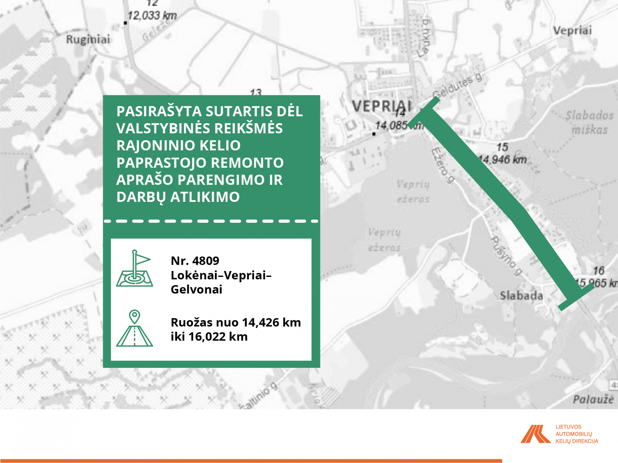 • Rajoninio kelio Nr. 4809 Lokėnai–Vepriai–Gelvonai ruožas nuo 14,426 iki 16,022;