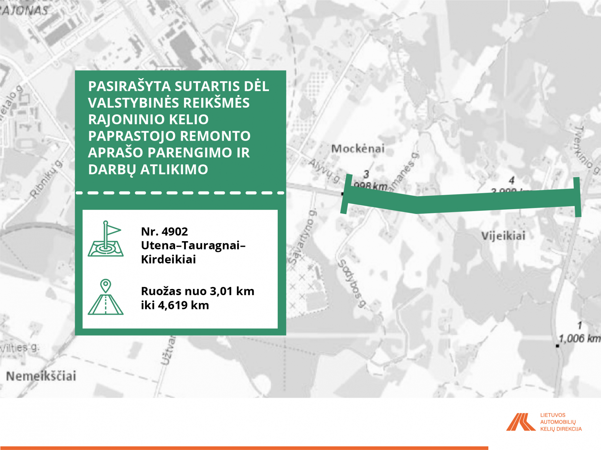 • Rajoninio kelio Nr. 4902 Utena–Tauragnai–Kirdeikiai ruožas nuo 3,01 iki 4,619 km;