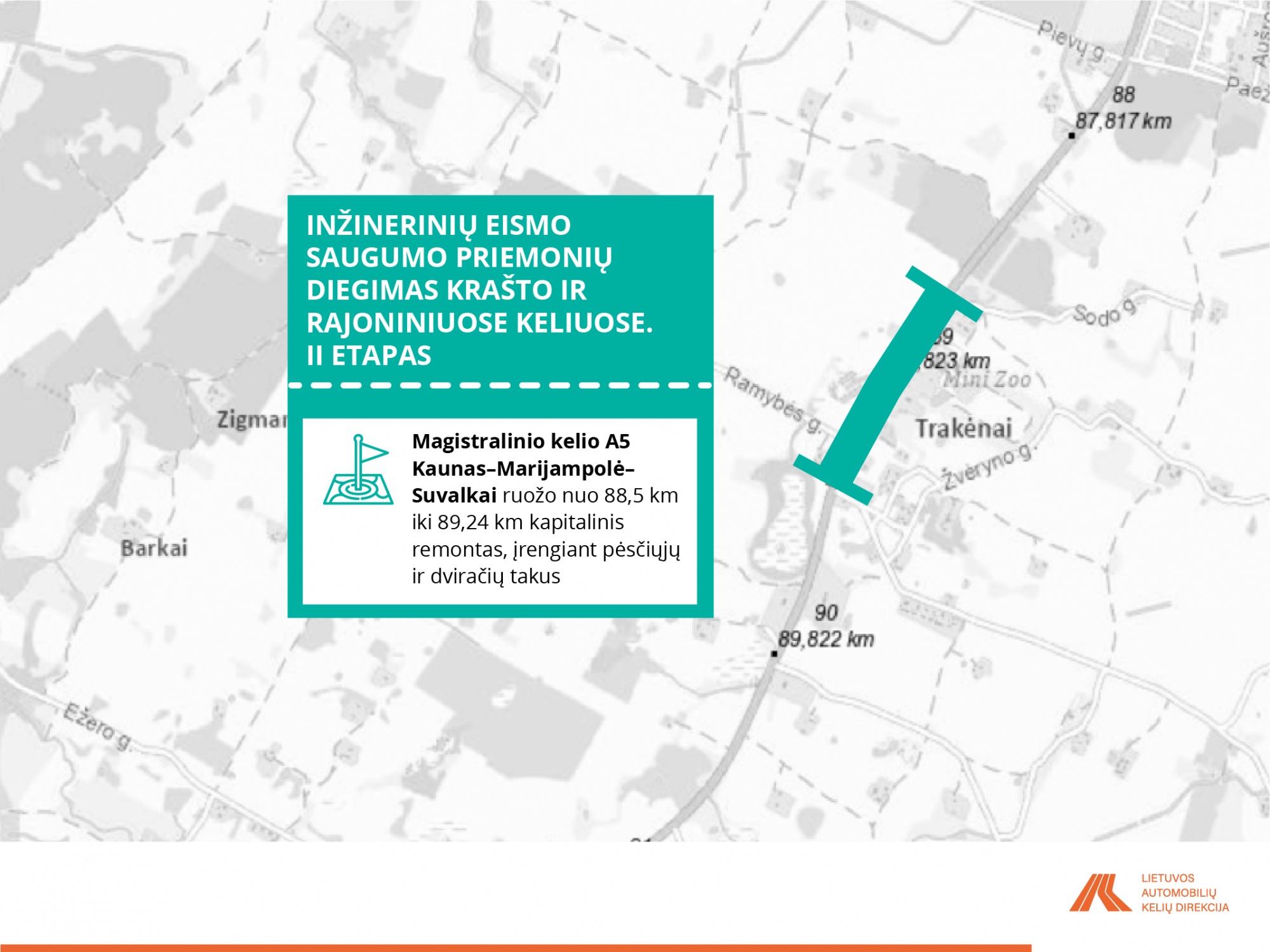• Magistralinio kelio A5 Kaunas – Marijampolė–Suvalkai ruožas nuo 88,50 iki 89,24 km kapitalinis remontas, įrengiant pėsčiųjų ir dviračių takus.