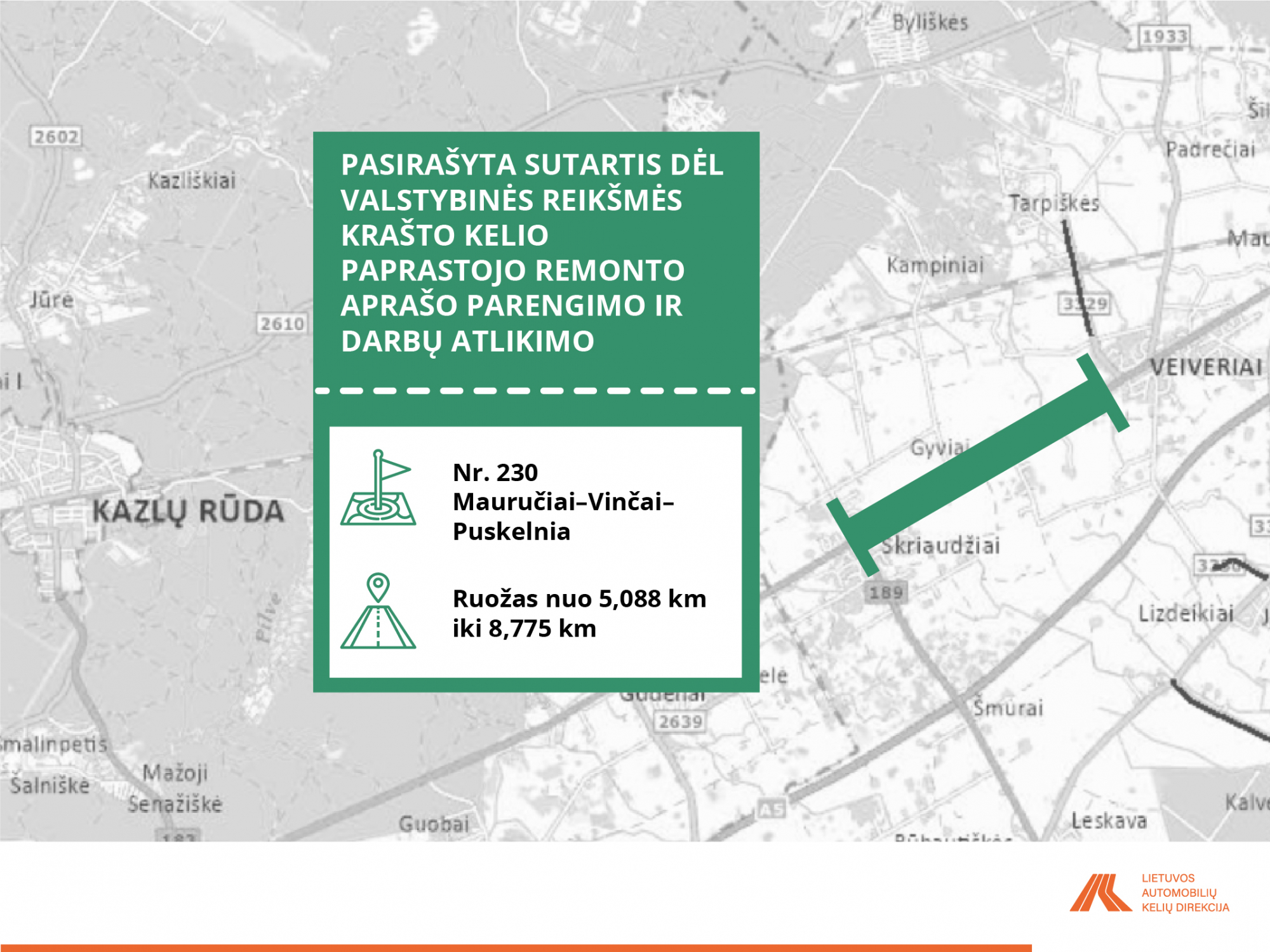Lietuvos automobilių kelių direkcija prie Susisiekimo ministerijos pasirašė 11 sutarčių dėl esamos kelio asfalto dangos atnaujinimo darbų ir vieną sutartį dėl inžinerinių eismo saugumo priemonių diegimo.