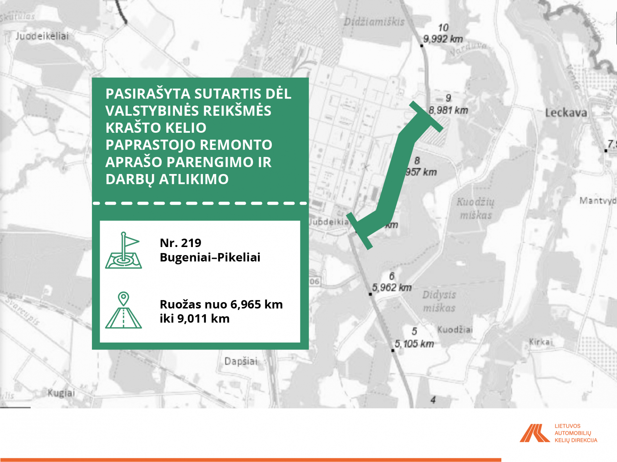 • Krašto kelio Nr. 219 Bugeniai–Pikeliai ruožas nuo 6,965 iki 9,011 km;