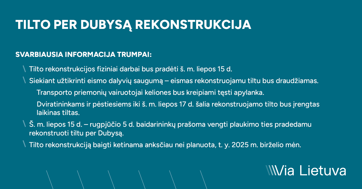 Akcinė bendrovė „Via Lietuva“ informuoja, kad š. m. liepos 15 d. pradedami fiziniai tilto per Dubysą rekonstravimo darbai. Siekiant užtikrinti eismo dalyvių saugumą, keisis eismo organizavimo tvarka – transporto eismas vyks apylanka, pėsčiųjų ir dviratininkų – laikinu tiltu. Planuojama, kad tilto rekonstravimo darbai bus baigti keliais mėnesiais anksčiau nei planuota – kitų metų vasaros pradžioje.
