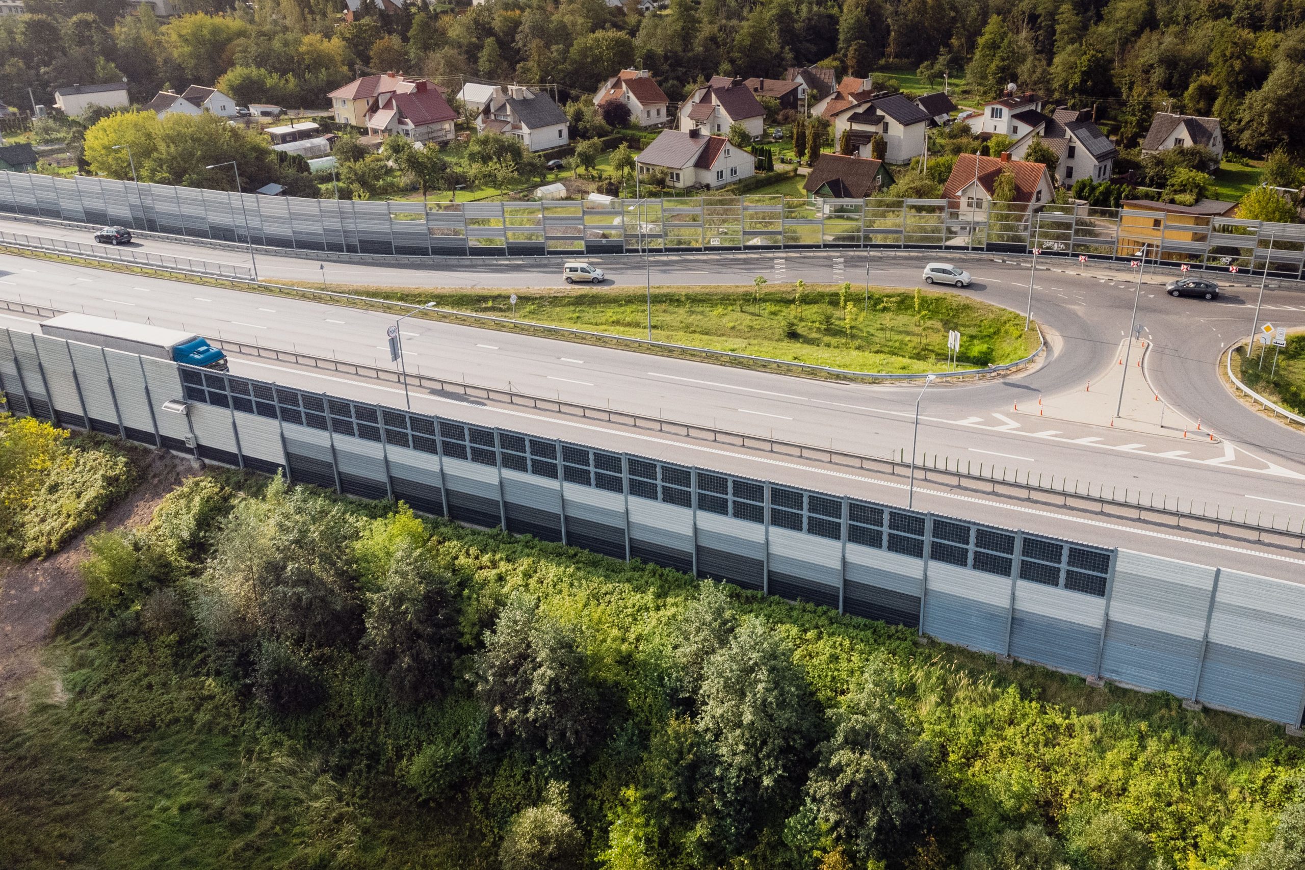 Saulės moduliai ant triukšmą mažinančių užtvarų įrengti magistralinio kelio Vilnius-Kaunas-Klaipėda atkarpoje ties Grigiškėmis. Ant triukšmo atitvarų įrengti saulės moduliai veikia realiomis lauko sąlygomis, neturi jokios įtakos triukšmą mažinančių užtvarų savybėms.