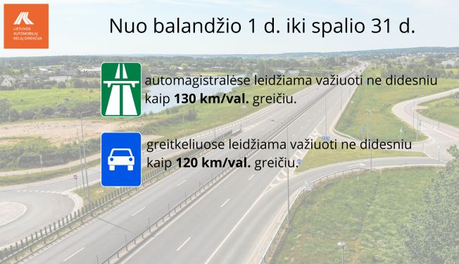 Taip pat nuo balandžio 1 d. automagistralėse ir greitkeliuose didėja maksimalus leistinas greitis. Lengvaisiais automobiliais, krovininiais automobiliais, kurių didžiausioji leidžiamoji masė ne didesnė kaip 3,5 t, motociklais ir triračiais automagistralėse leidžiama važiuoti ne didesniu kaip 130 km/val. greičiu, greitkeliuose – ne didesniu kaip 120 km/val. greičiu. Toks pats greitis išlieka keliuose su asfalto danga – juose maksimalus leistinas greitis yra 90 km/val., kituose keliuose maksimalus leistinas greitis išlieka 70 km/val.