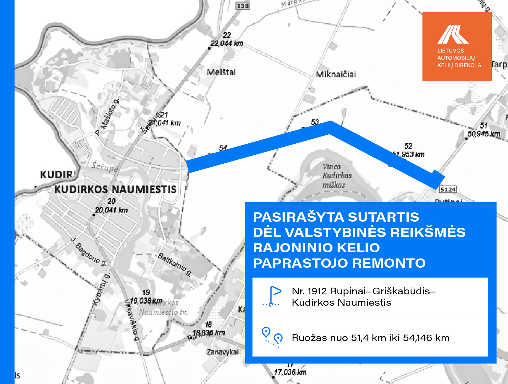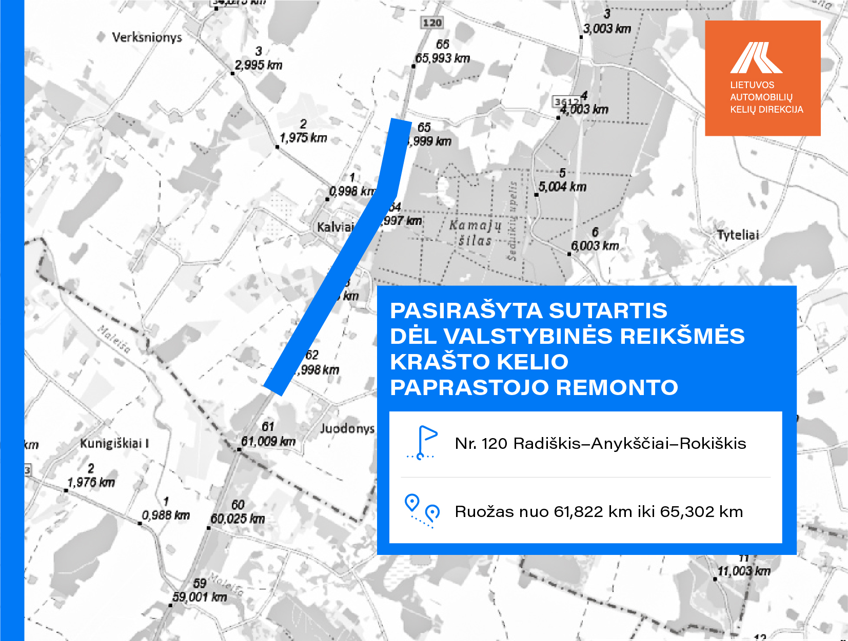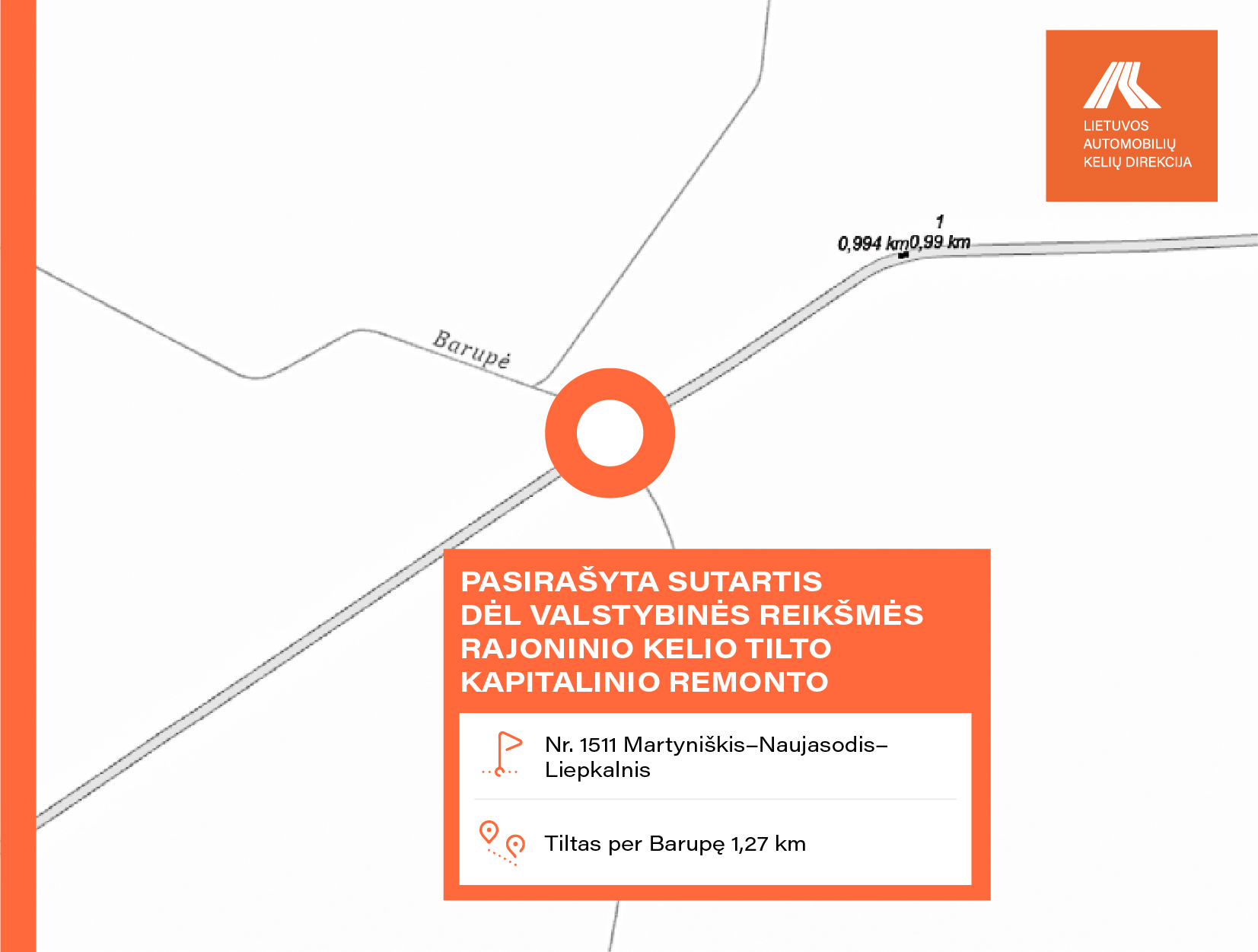 VĮ Lietuvos automobilių kelių direkcija su rangovais sudarė 18 rangos darbų sutarčių. Įgyvendinant sutartis bus vykdomi valstybinės reikšmės krašto ir rajoninių kelių, esančių Molėtų, Anykščių, Rokiškio, Šakių, Vilkaviškio, Kretingos, Klaipėdos, Trakų rajonuose, paprastojo ir kapitalinio remonto darbai, tvarkomas tiltas per Barupę Jonavos rajone.