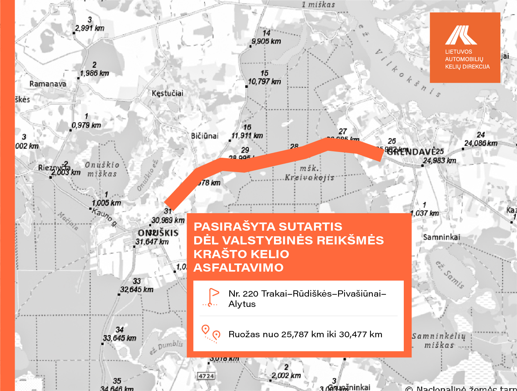 Krašto kelio Nr. 220 Trakai–Rūdiškės–Pivašiūnai–Alytus ruožo nuo 25,787 iki 30,477 km;