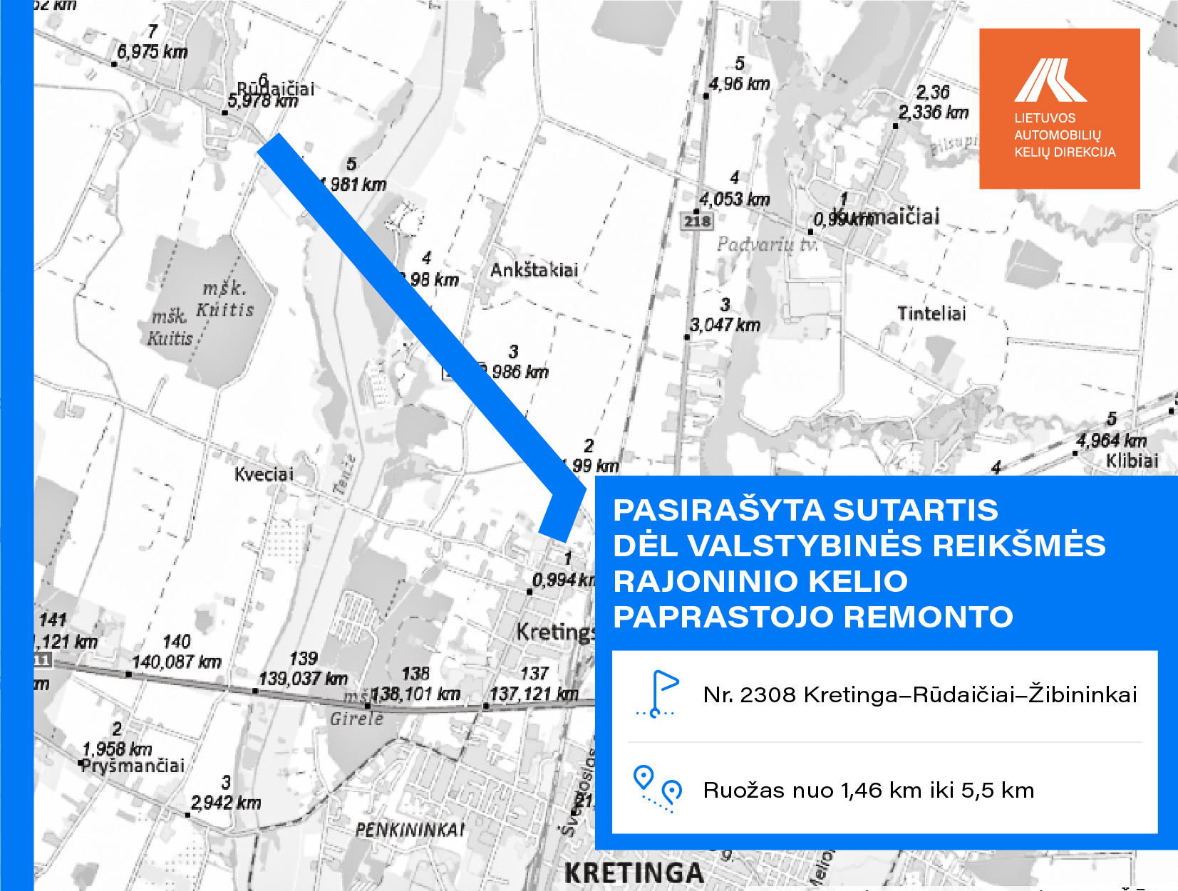Rajoninio kelio Nr. 2308 Kretinga–Rūdaičiai–Žibininkai ruože nuo 1,460 iki 5,500 km;