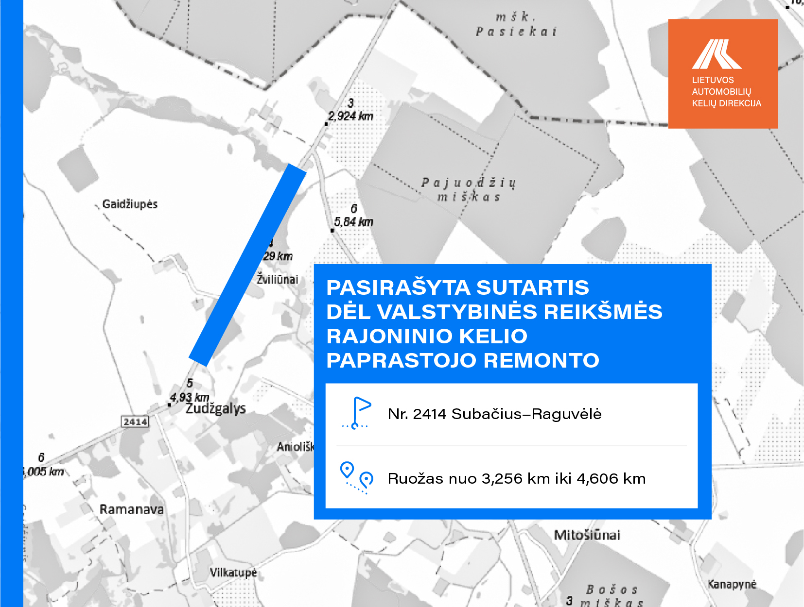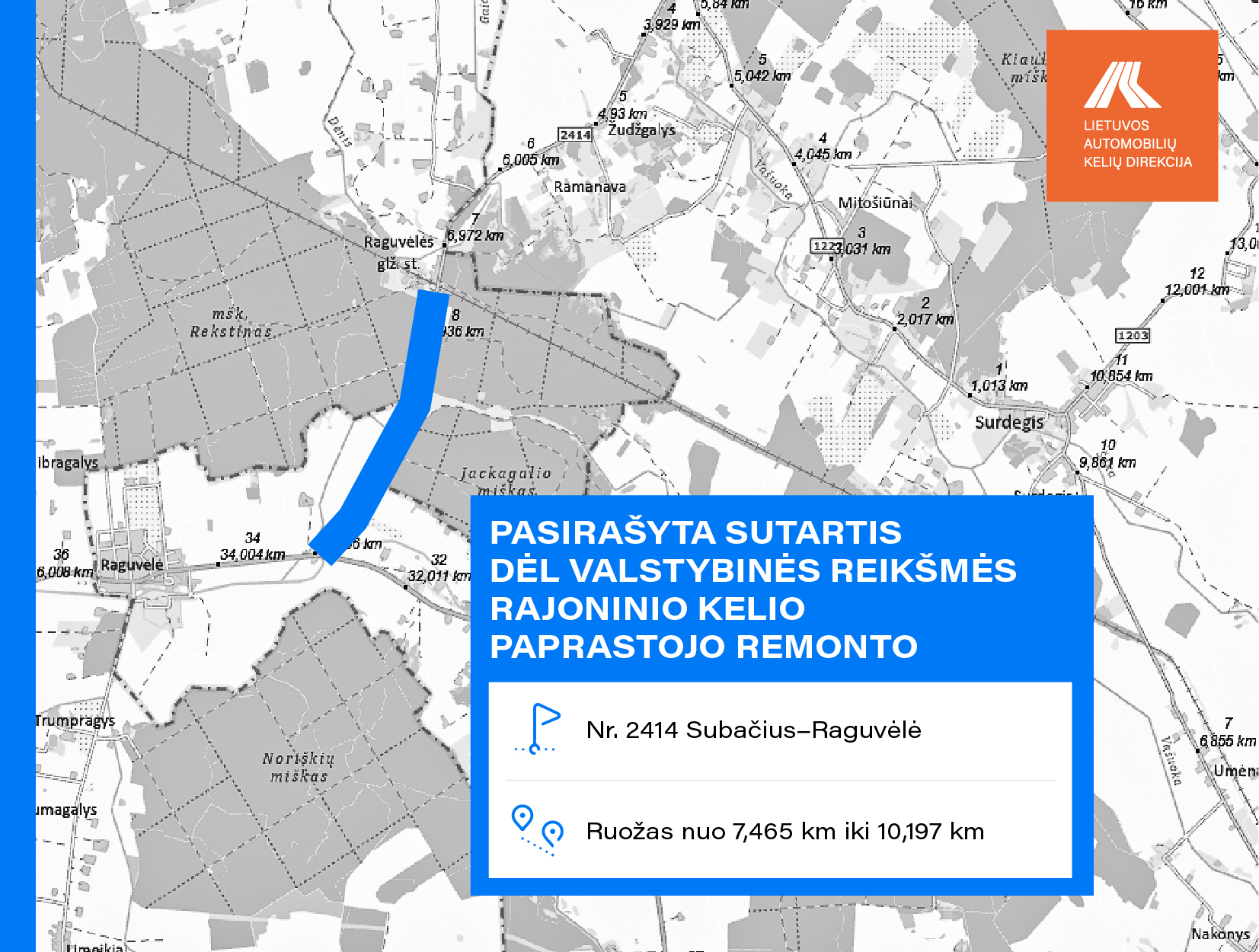 Rajoninio kelio Nr. 2414 Subačius–Raguvėlė ruože nuo 3,256 km iki 4,606 km ir ruožo nuo 7,465 km iki 10,197 km;
