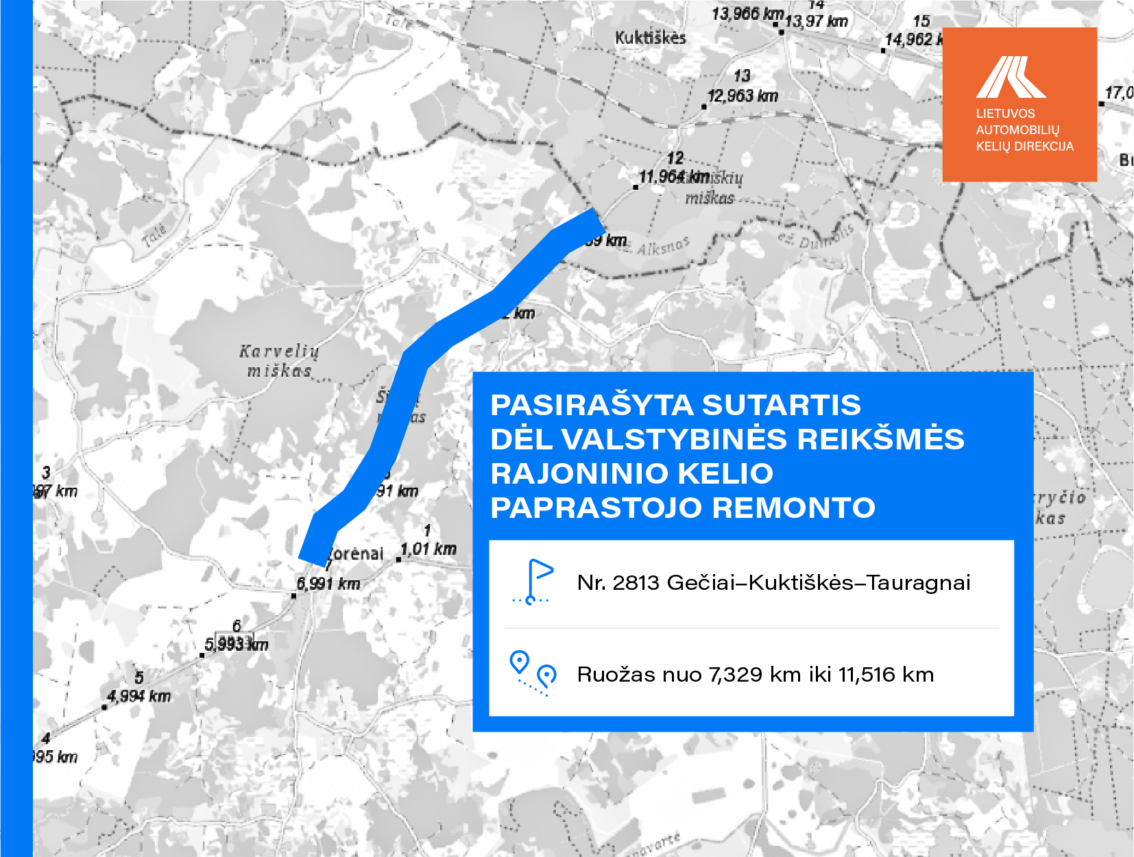 Rajoninio kelio Nr. 2813 Gečiai–Kuktiškės–Tauragnai ruože nuo 7,329 km iki 11,516 km;