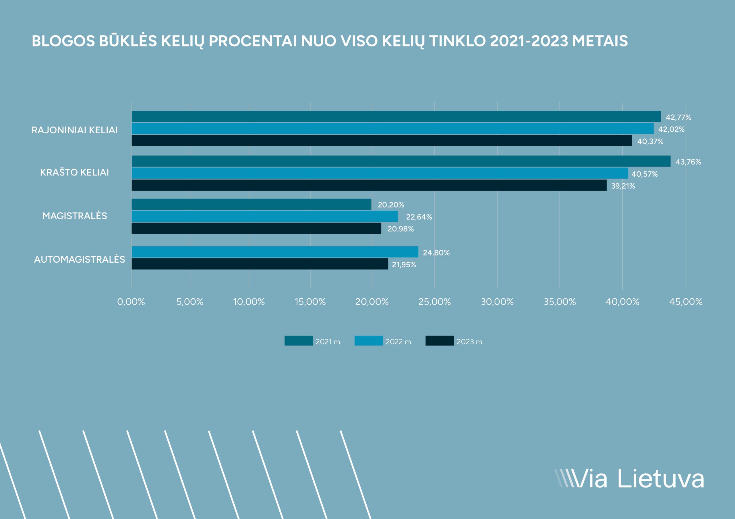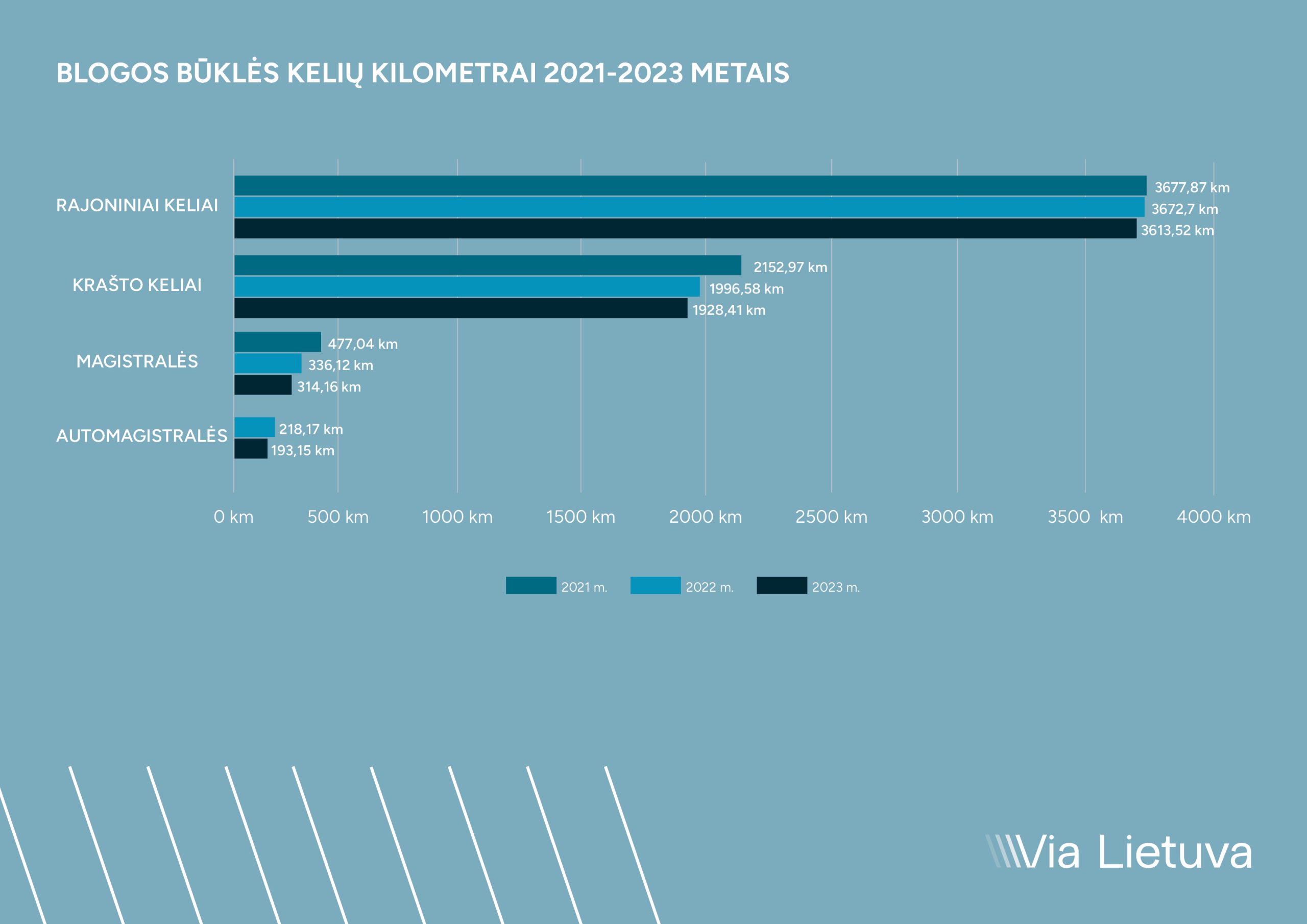 Bendras, neatitinkančių kokybės kriterijų, valstybinės reikšmės kelių procentas pernai sudarė 37 proc., tai reiškia, jog beveik 4 iš 10 Lietuvos kelių yra blogos būklės. Iš viso blogos būklės valstybinės reikšmės kelių pernai šalyje buvo daugiau nei 6 tūkst. km. Kartu su keliais, kurie šiuo metu siekia kritinę ribą ir jų netvarkant šių kelių kokybė ims sparčiai blogėti – valstybinės reikšmės kelių tinkle skaičiuojama netoli 8,5 tūkst. km.
