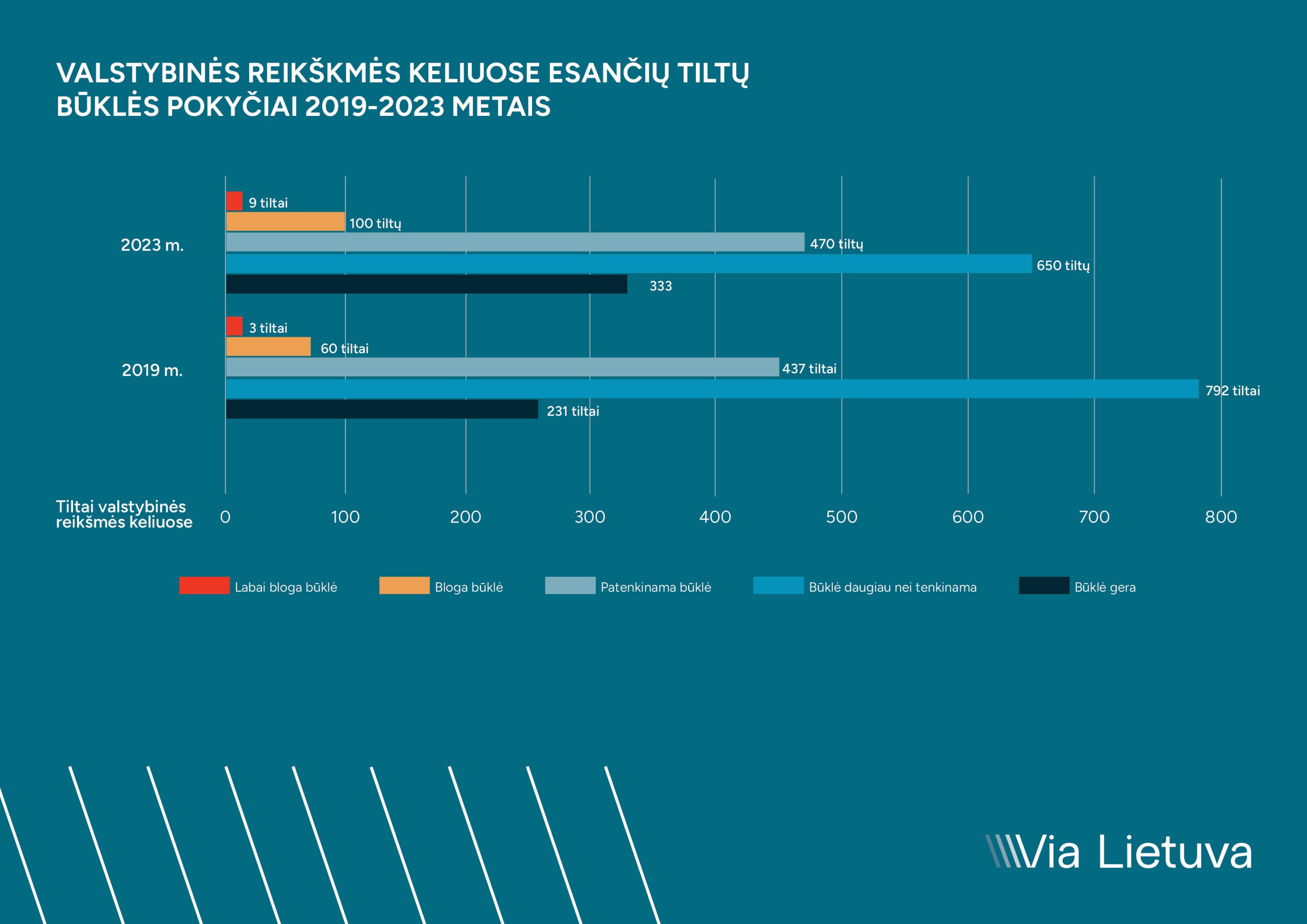 Labiausiai per metus pagerėjo automagistralių kelių dangos būklė – apie 3 proc., magistralinių ir rajoninių kelių su asfalto danga būklė gerėjo apie 1,7 proc., krašto kelių būklė gerėjo kiek daugiau nei 1,4 proc. Per trejus metus „Via Lietuva“ suremontavo – 678 km kelių (iš jų pernai, po ilgos pertraukos, buvo intensyviai tvarkomi magistraliniai keliai, per metus sutvarkyta 30 km magistralinio kelių tinklo), pastatė ar sutvarkė 88 valstybinės reikšmės keliuose esančius tiltus ir viadukus.