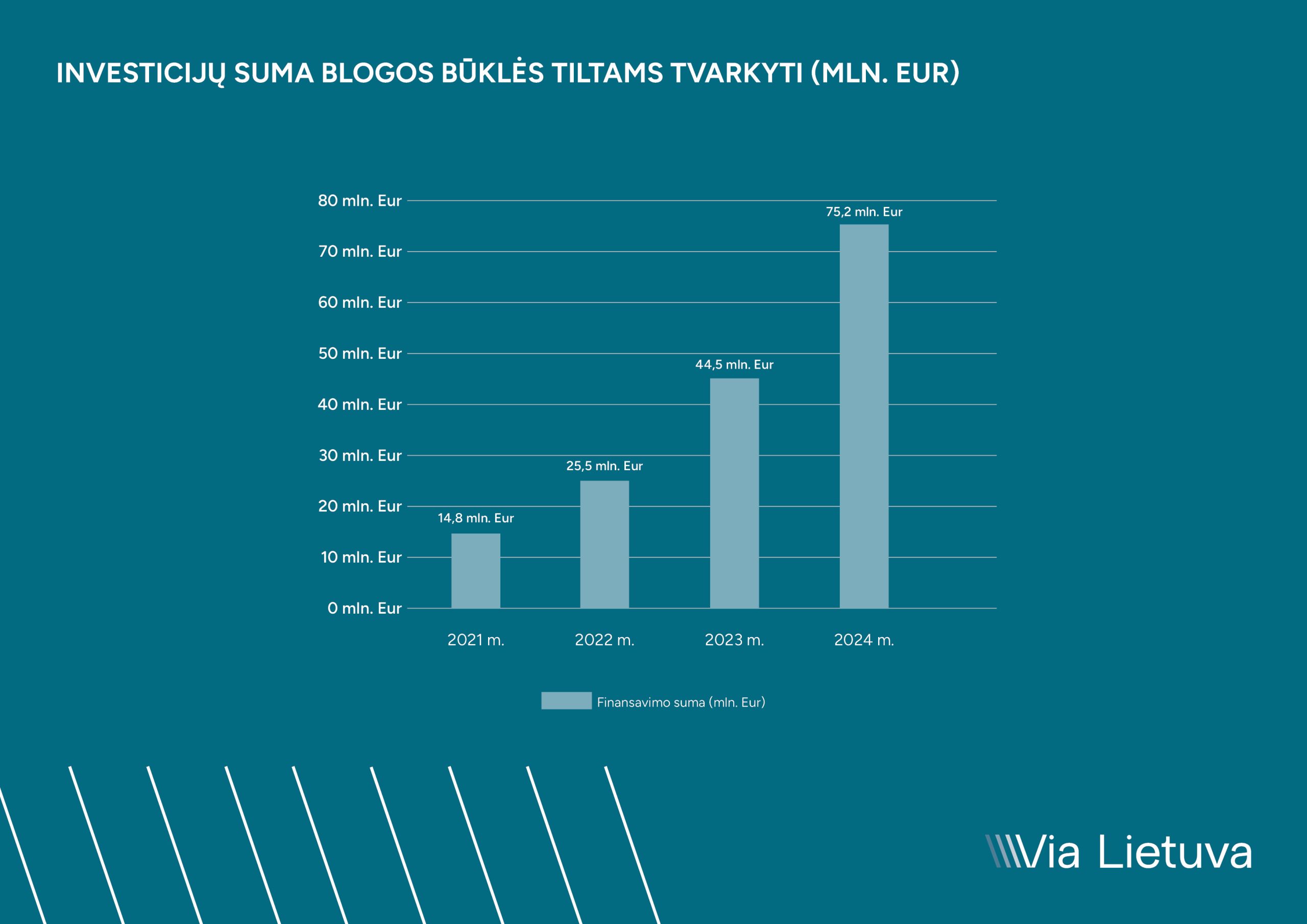 Pagal „Via Lietuva“ skaičiavimus, šiuo metu bendras lėšų poreikis, siekiant sutvarkyti daugiau nei 6 tūkst. km blogos būklės valstybinės reikšmės kelių, yra 5,4 mlrd. eurų. Blogos būklės tiltų, kurių skaičius nuolat auga ir šiuo metu siekia 109, sutvarkyti iki patenkinamos būklės reiktų dar apie 470 mln. eurų. Norint sutvarkyti ir tuos kelius, kurie šiuo metu yra ties kritine riba (būklė dar patenkinama, tačiau jų netvarkant – keliai ims sparčiai blogėti), bendras lėšų poreikis yra 6,5 mlrd. Eur. Tuo tarpu norint sutvarkyti visus tiltus, kurių būklė jau dabar yra bloga ir tuos, kurie yra teis kritine riba – reikalingos apie 1 mlrd. Eur siekiančios investicijos.