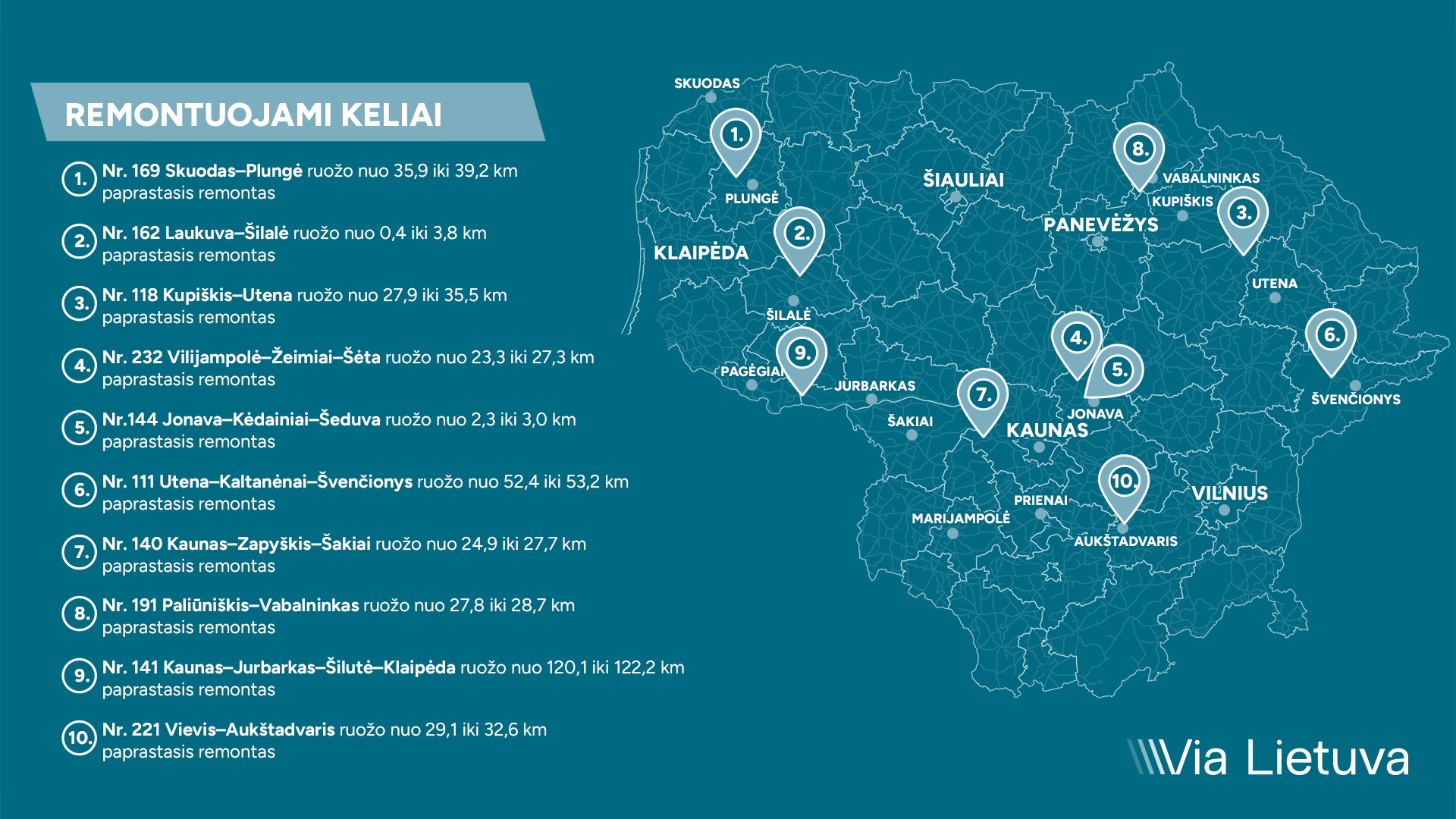 Iš viso „Via Lietuva“ šiuo metu tvarko arba artimiausiu metu planuoja pradėti tvarkyti daugiau nei 220 km valstybinės reikšmės magistralinių, rajoninių, krašto kelių bei žvyrkelių, atliekant paprastąjį ar kapitalinį remontą.