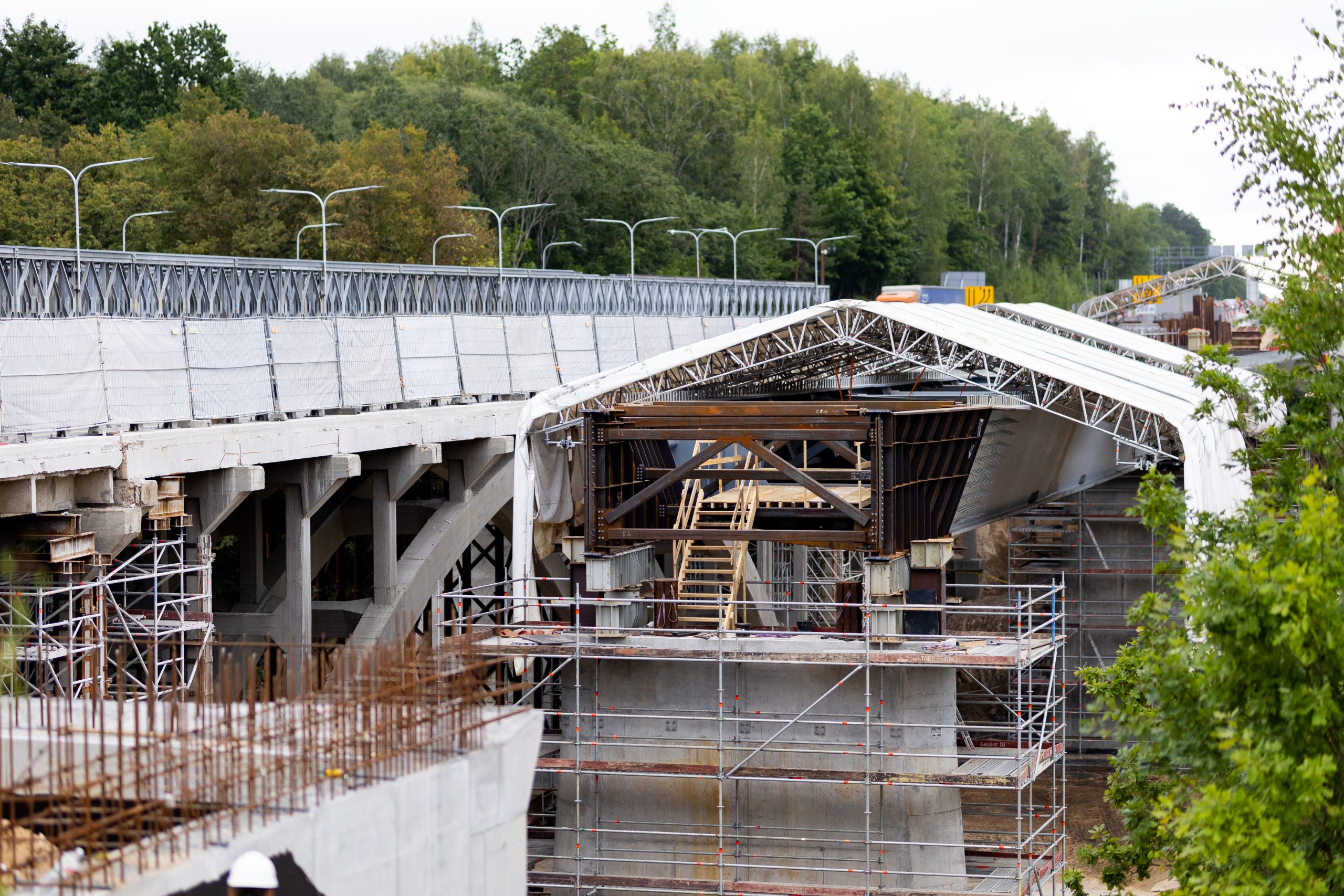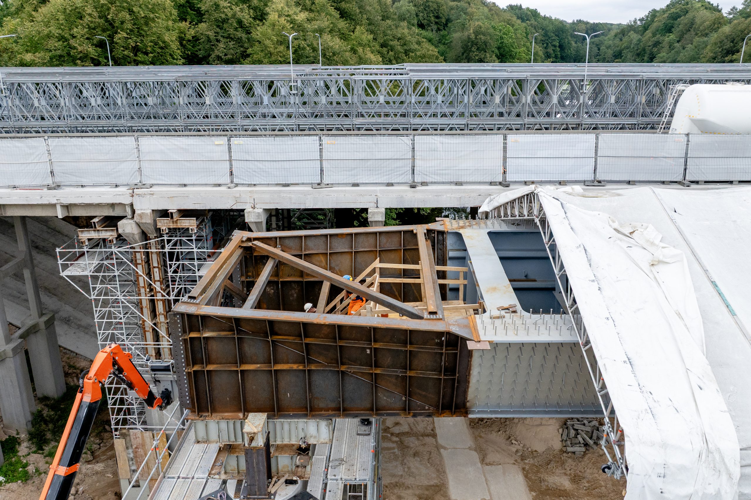 Statybvietėje sumontuoti plieniniai perdangos elementai sujungiami tarpusavyje juos suvirinant ir užstumiami ant išbetonuotų tilto atramų. Šiuo metu jau yra užstumta 70 proc. visos perdangos. Bendras perdangos svoris sieks 750 tonų.