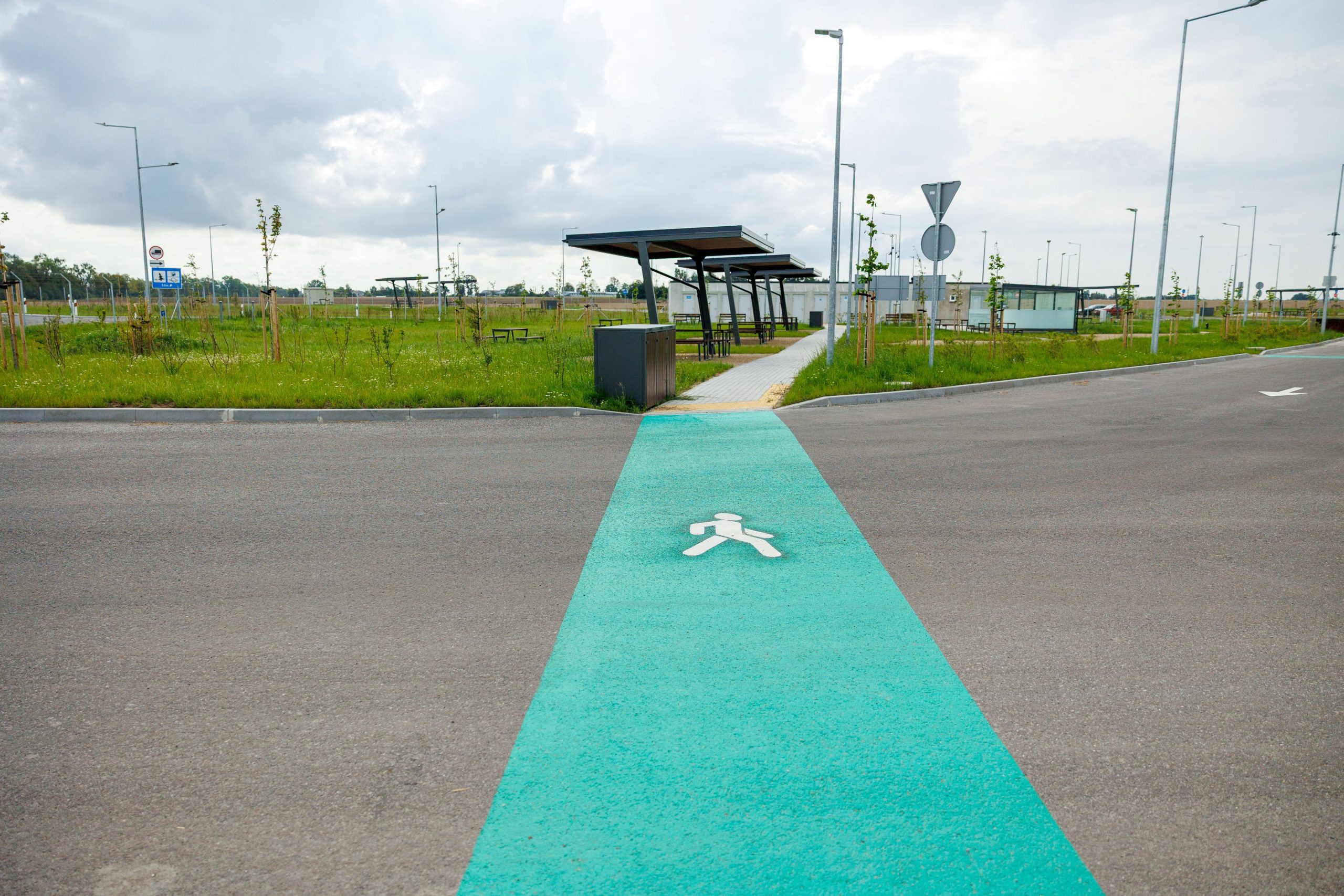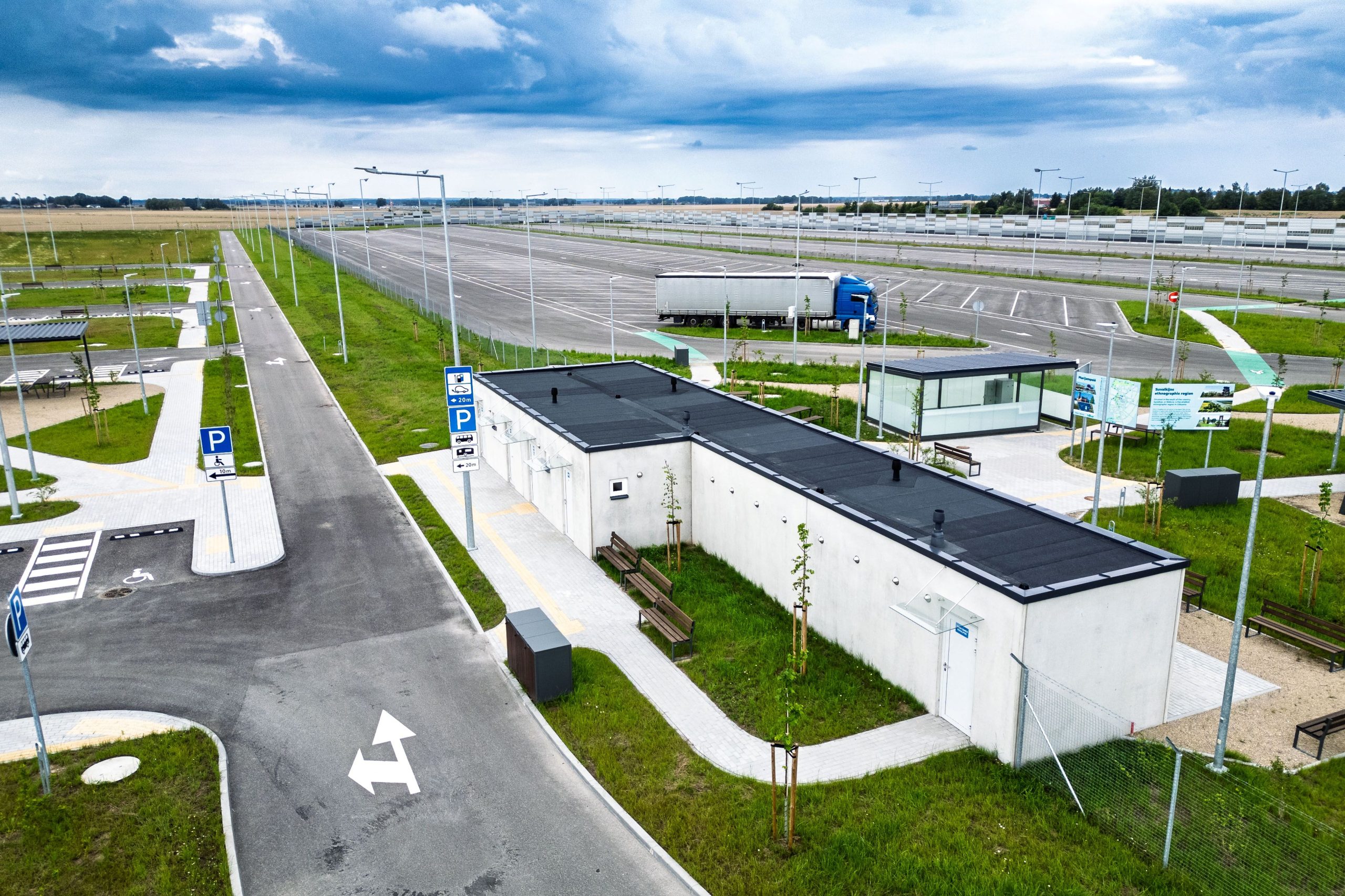 Apie 11 ha ploto teritorijoje įrengtos atskiros zonos skirtingo tipo transporto priemonėms – lengviesiems automobiliams, krovininiam transportui, autobusams, kemperiams ir elektromobiliams. Iš viso čia suprojektuotos 354 stovėjimo vietos: 234 sunkvežimiams, 101 lengvajam automobiliui, 6 – neįgaliųjų transportui, 9 vietos autobusams ir kemperiams bei 4 elektromobiliams su įkrovimo stotelėmis po stoginėmis.