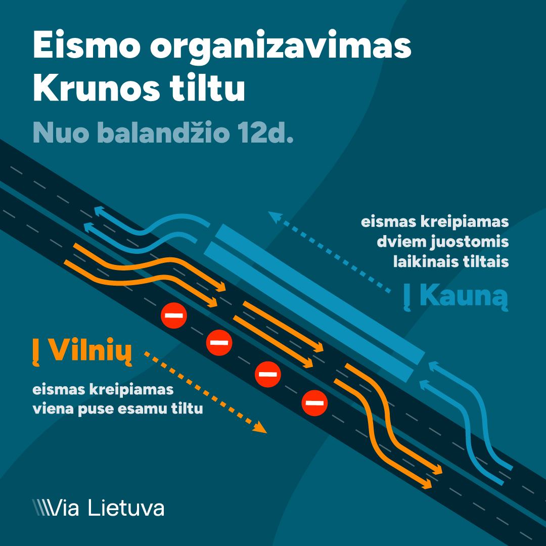 Šiuo metu vyksta Kauno ir Kaišiadorių rajonuose esančio tilto per Kruną rekonstravimo darbai. Dėl to jau nuo praėjusio šeštadienio, balandžio 12 d. eismas šioje automagistralės Vilnius–Kaunas–Klaipėda atkarpoje perorganizuotas.