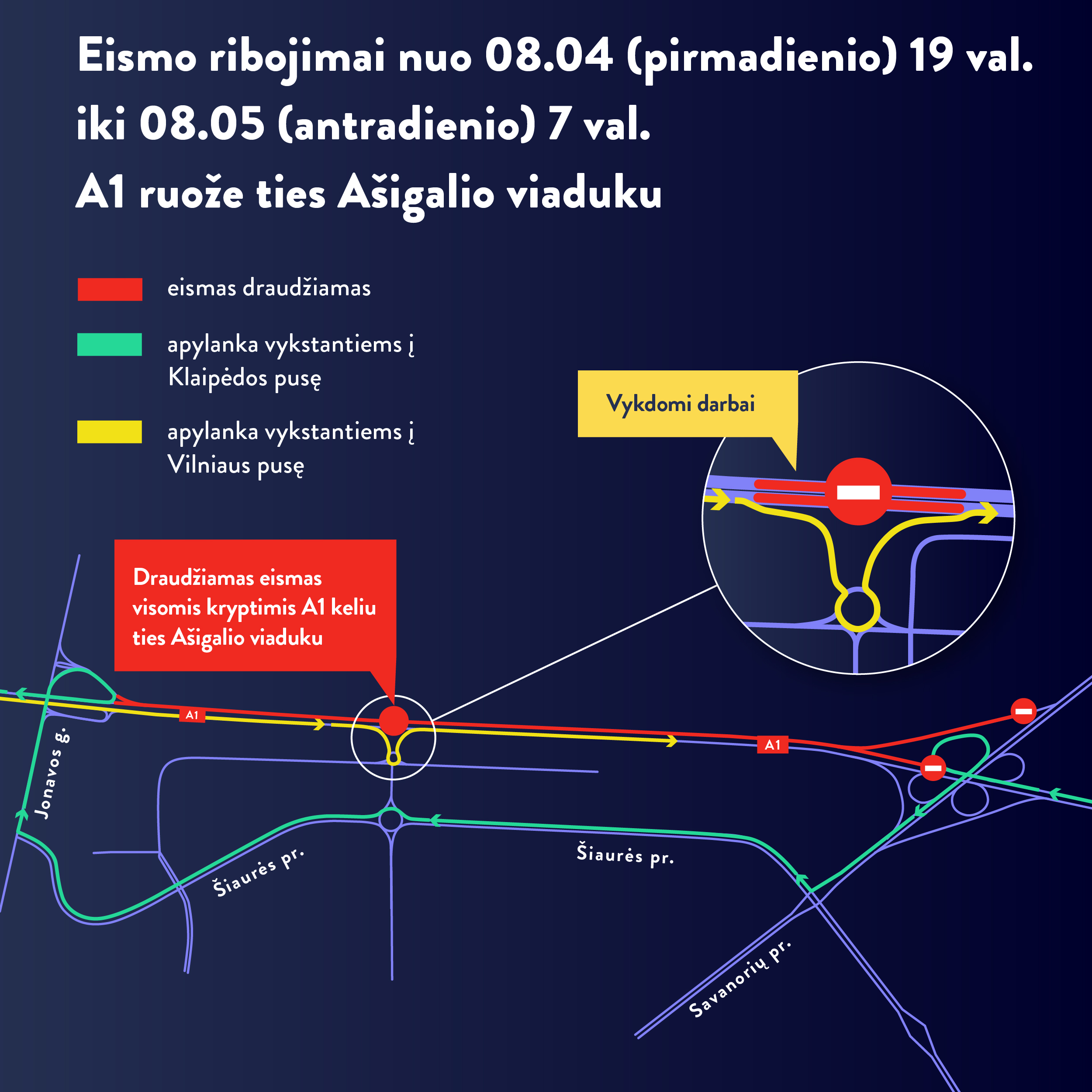 Ties Ašigalio gatve vykstant viaduko su greitėjimo ir lėtėjimo juostomis statybai, kitos savaitės pradžioje, rugpjūčio 4–5 dienomis, dėl saugumo bus laikinai uždaryta nedidelė atkarpa A1 magistralės transporto mazge tarp Savanorių prospekto ir Jonavos gatvės. Vairuotojams numatytos laikinos apylankos.